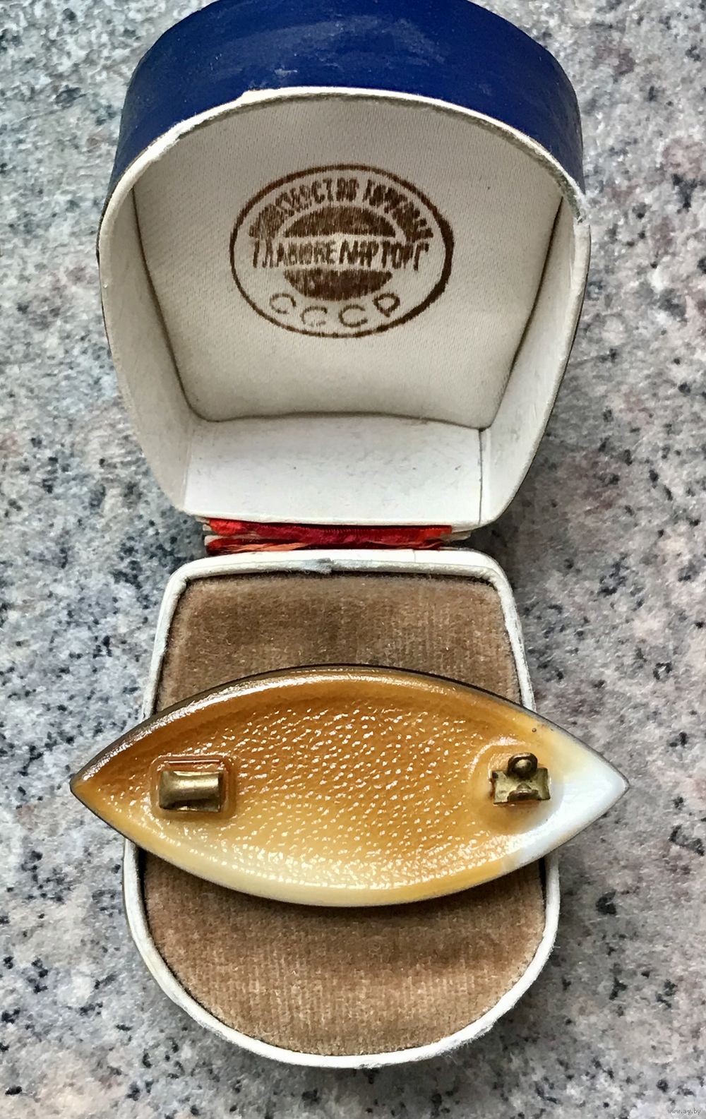 Брошь из глушеного стекла. Размер 5,2х2,2см. Нет застёжки, с лицевой стороны по краю местами сход позолоты. Все нюансы учтены в цене.