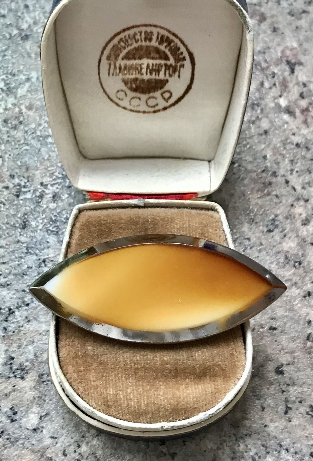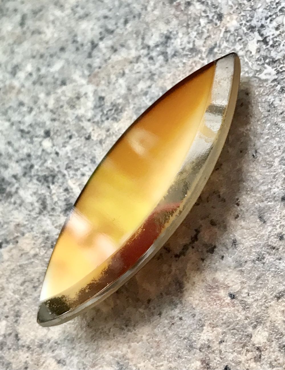 Брошь из глушеного стекла. Размер 5,2х2,2см. Нет застёжки, с лицевой стороны по краю местами сход позолоты. Все нюансы учтены в цене.