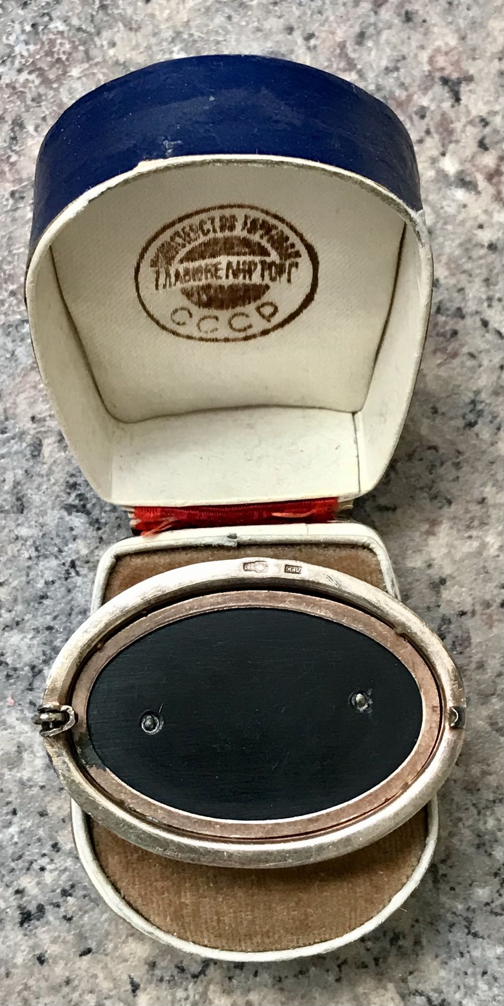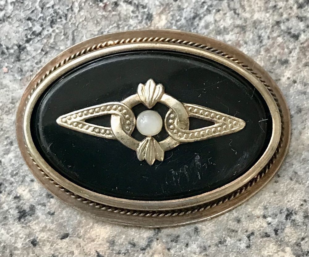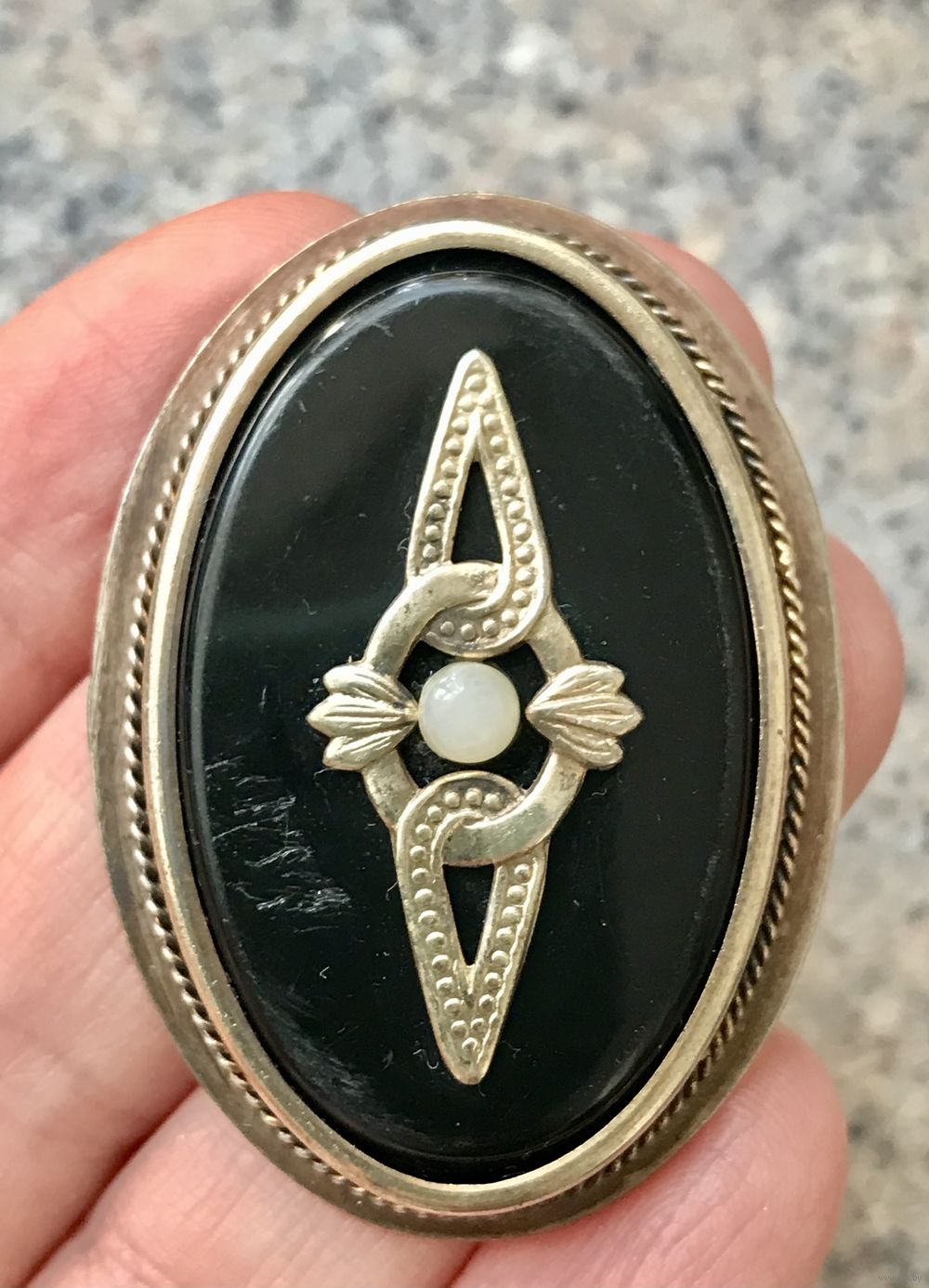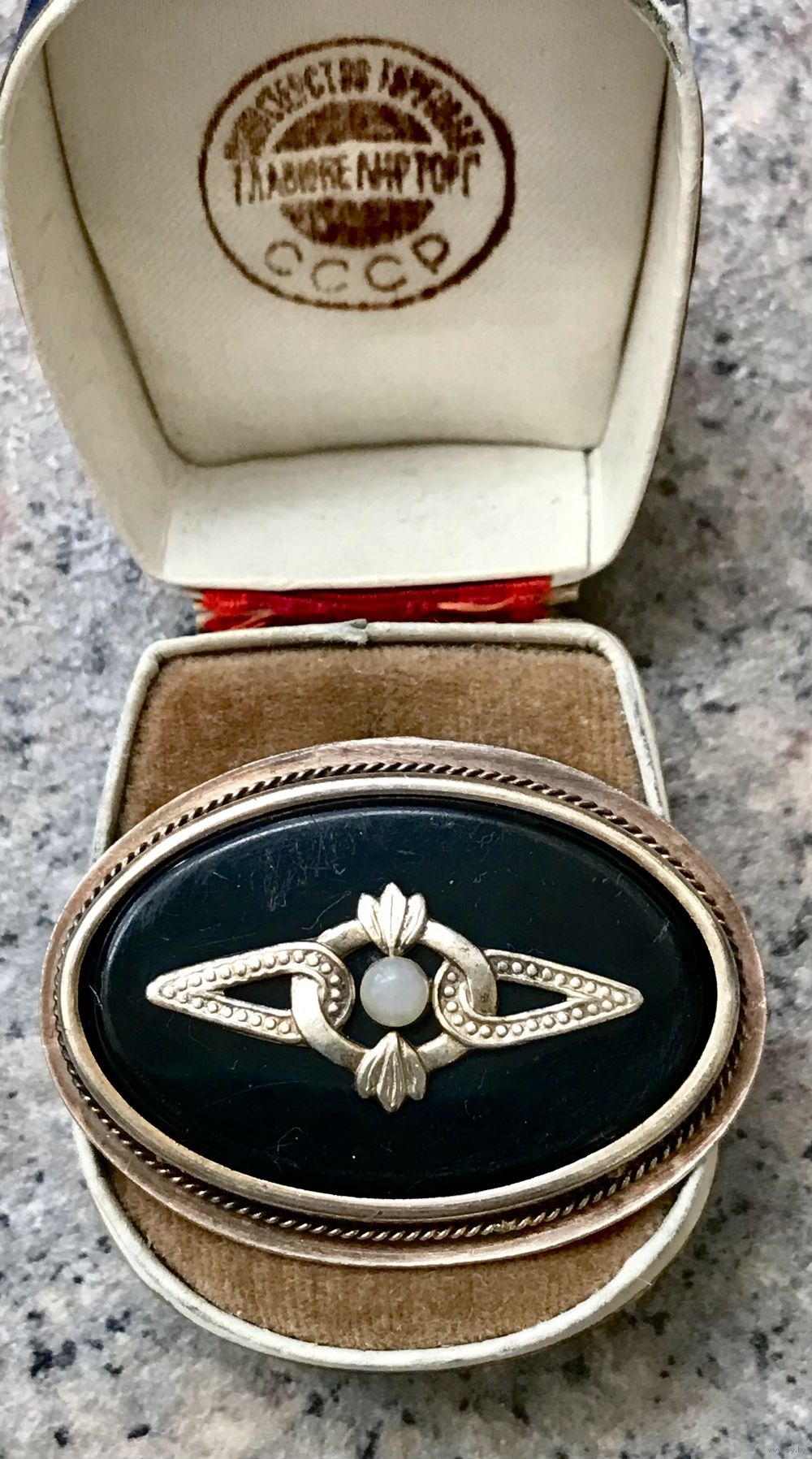 Брошь из серебра 875пр. с позолотой, лицевая сторона украшена бакелитовой вставкой чёрного цвета и жемчужиной (имитация). Брошь сделана в 1956г. на Ленинградской ювелирной фабрике. Брошь с утратами-нет иглы и фиксатора (можно переделать в кулон). На чёрной вставке есть царапины, с жемчужной вставки сошло покрытие. Размер броши 5,5х3,4см. Все нюансы учтены в цене.
