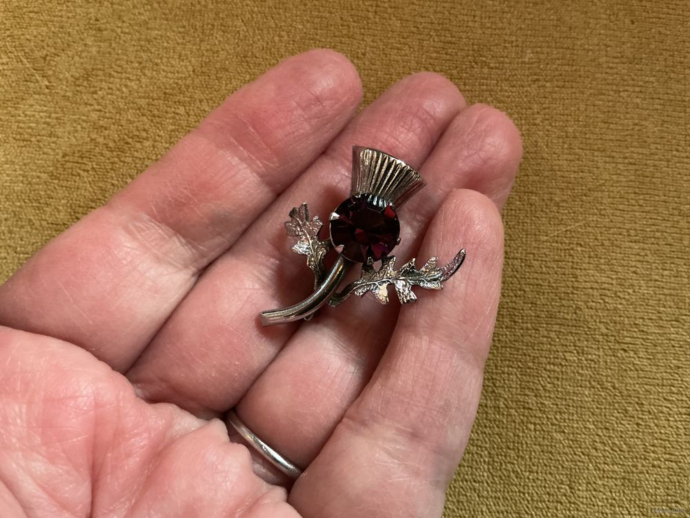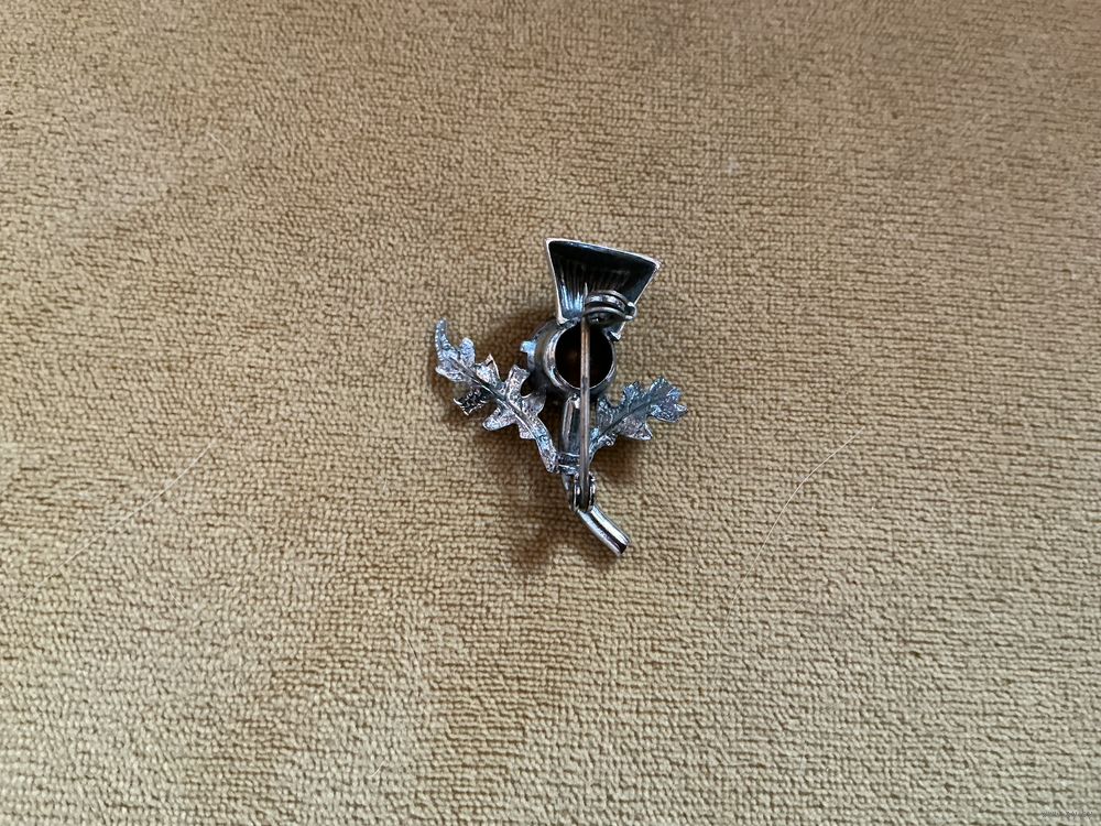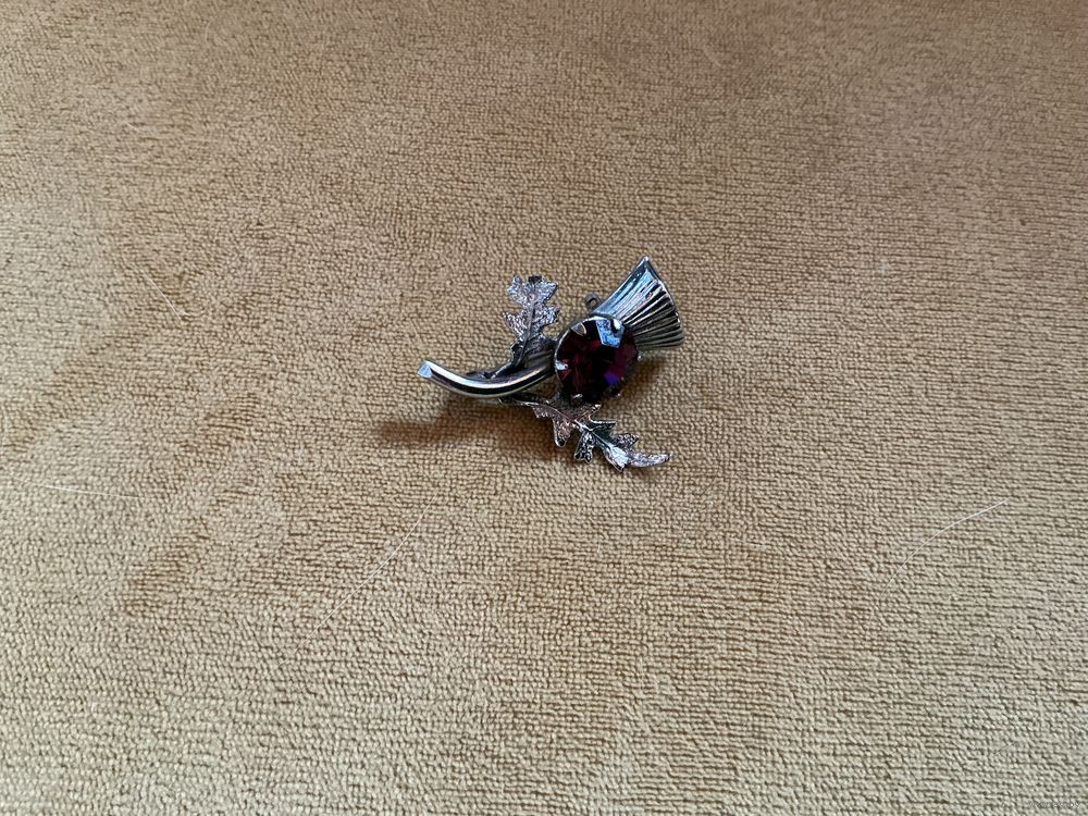Красивая брошь оберег, металл под серебро, аметистовое стекло, скол кончика веточки , 3 см х 3 см