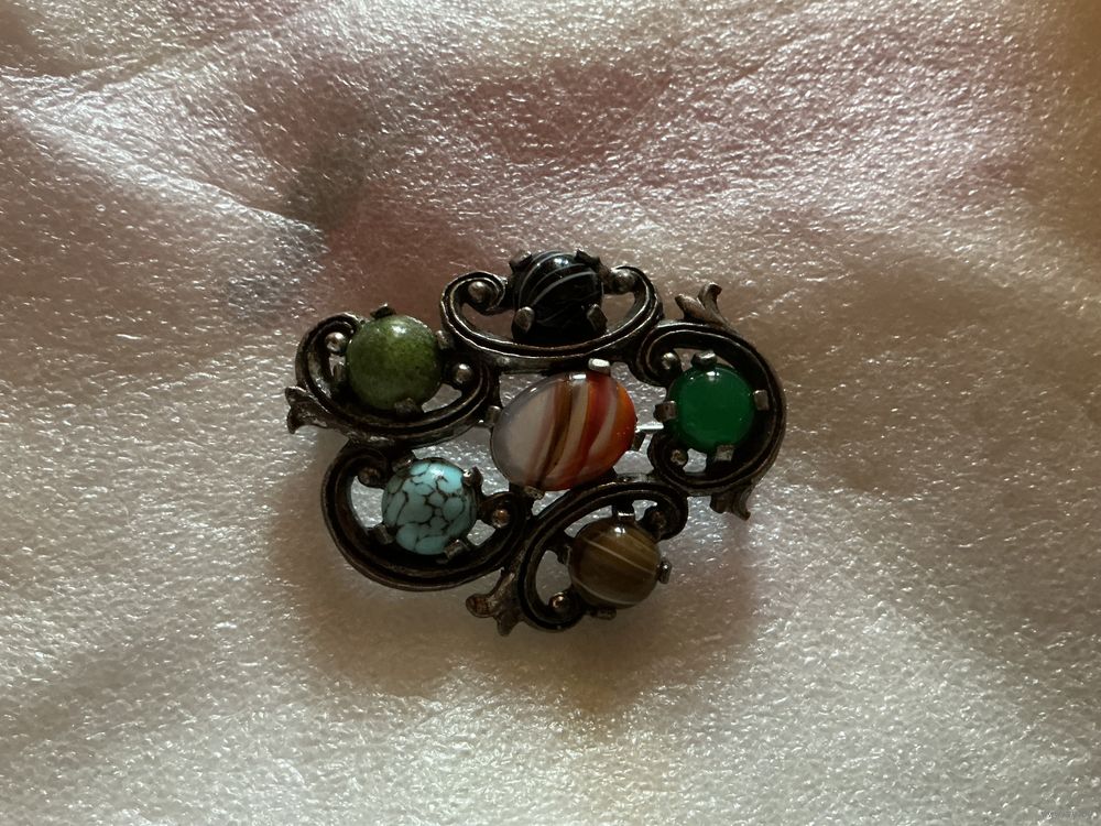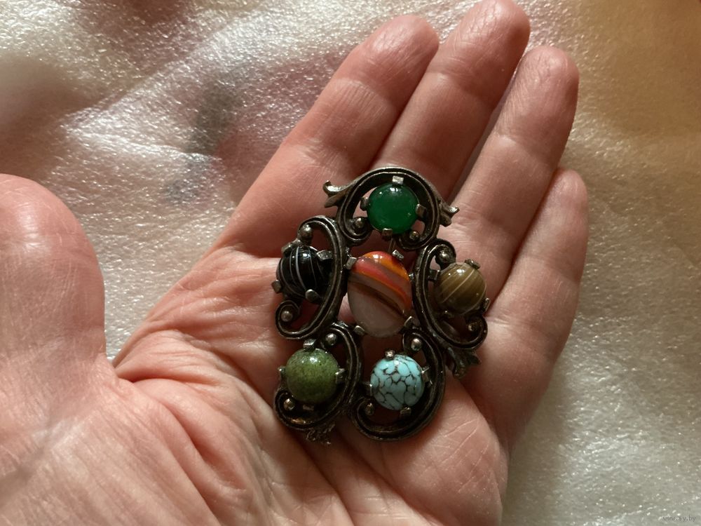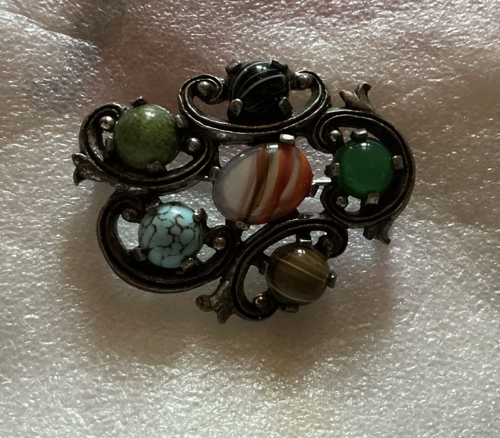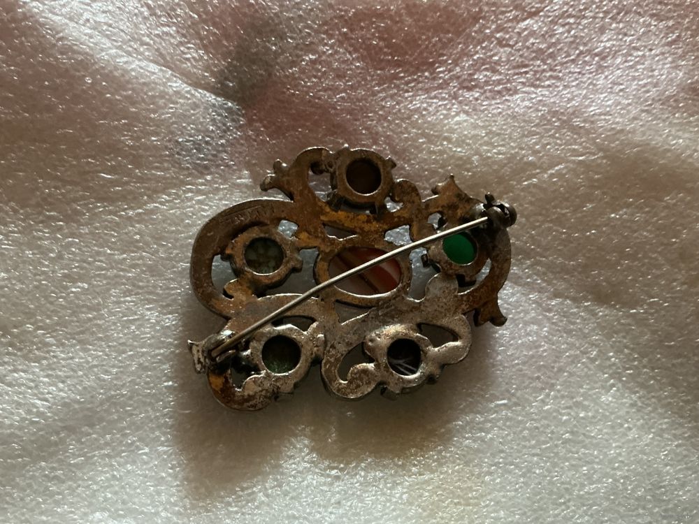 Крупная кельтская брошь 5, 5 см х 4 см , вставка смальта под натуральные камни , пекинское стекло , металл пьютер , клеймо