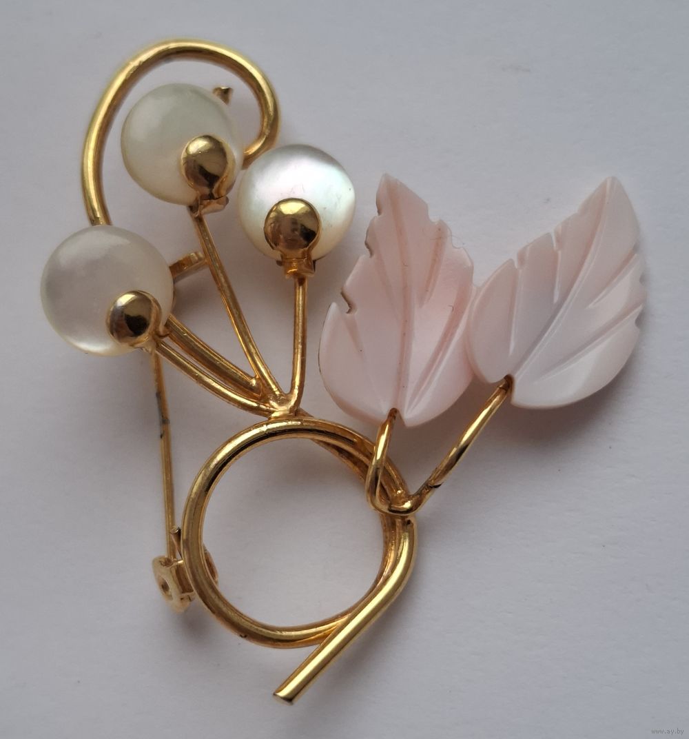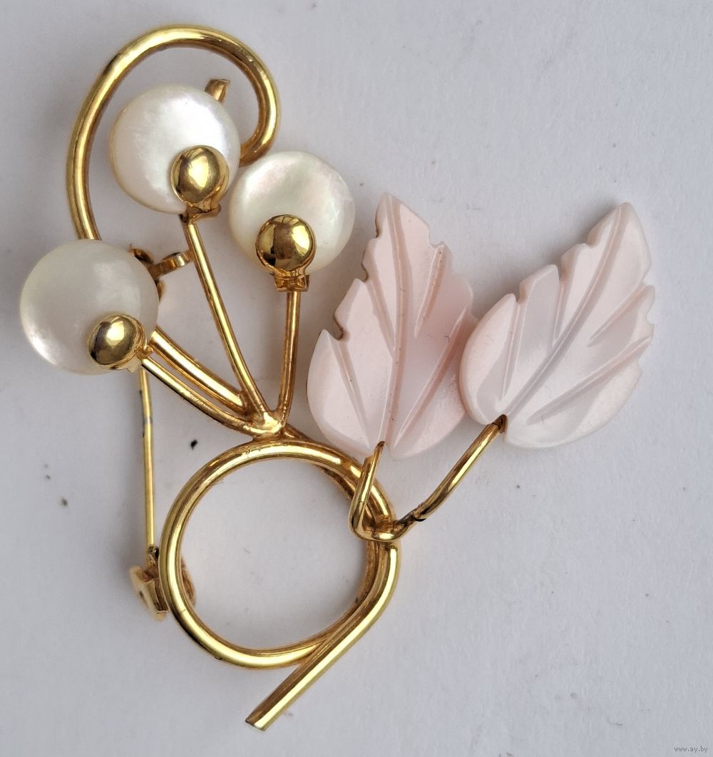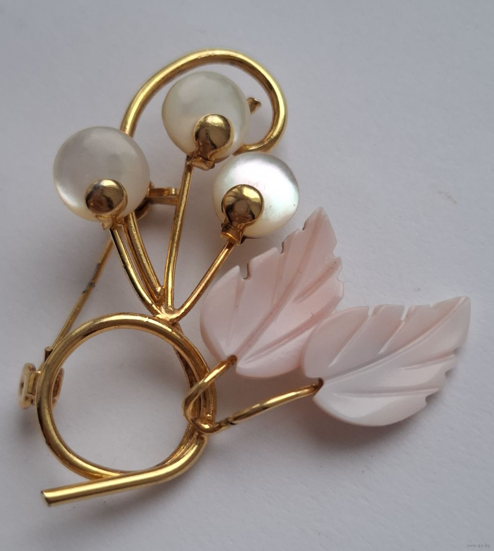 Брошь. Листики. Натуральный перламутр. Позолота. 70-80-е годы, Германия