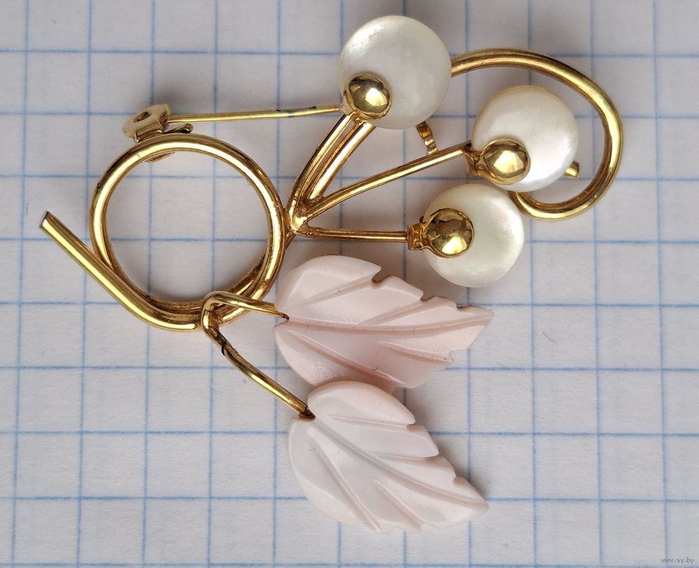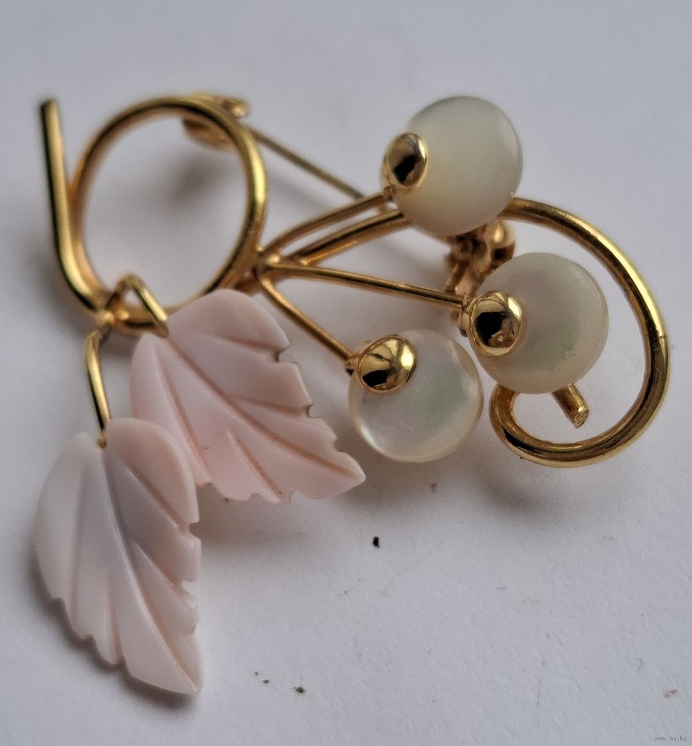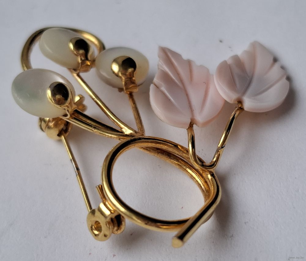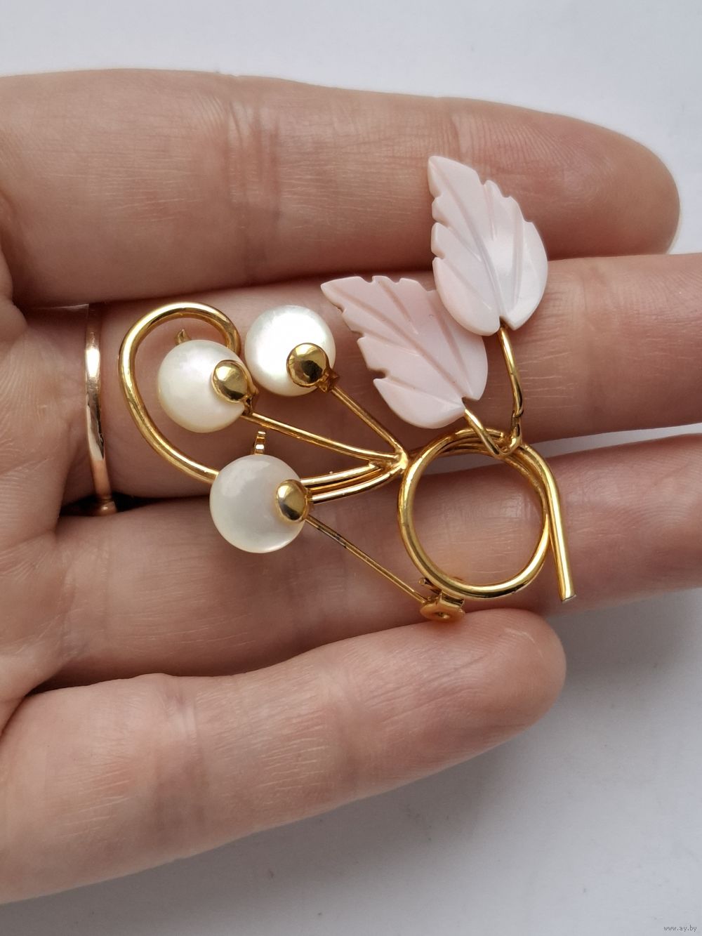 Брошь. Листики. Натуральный перламутр. Позолота. 70-80-е годы, Германия