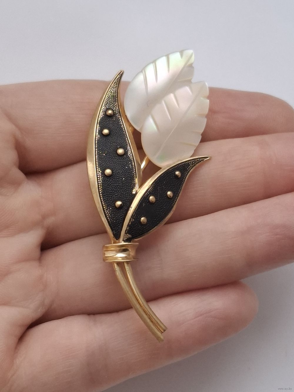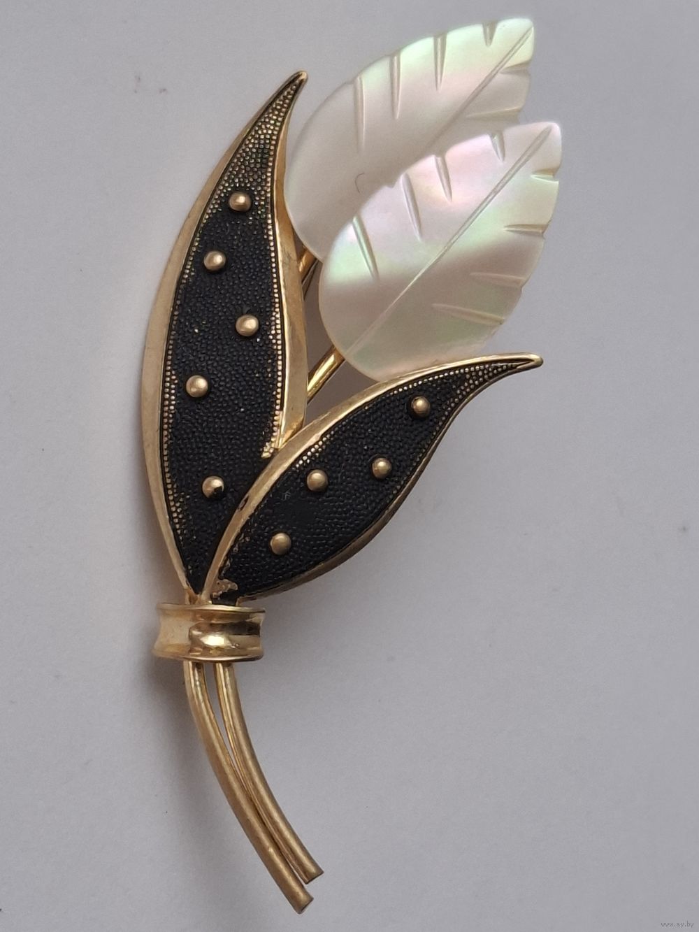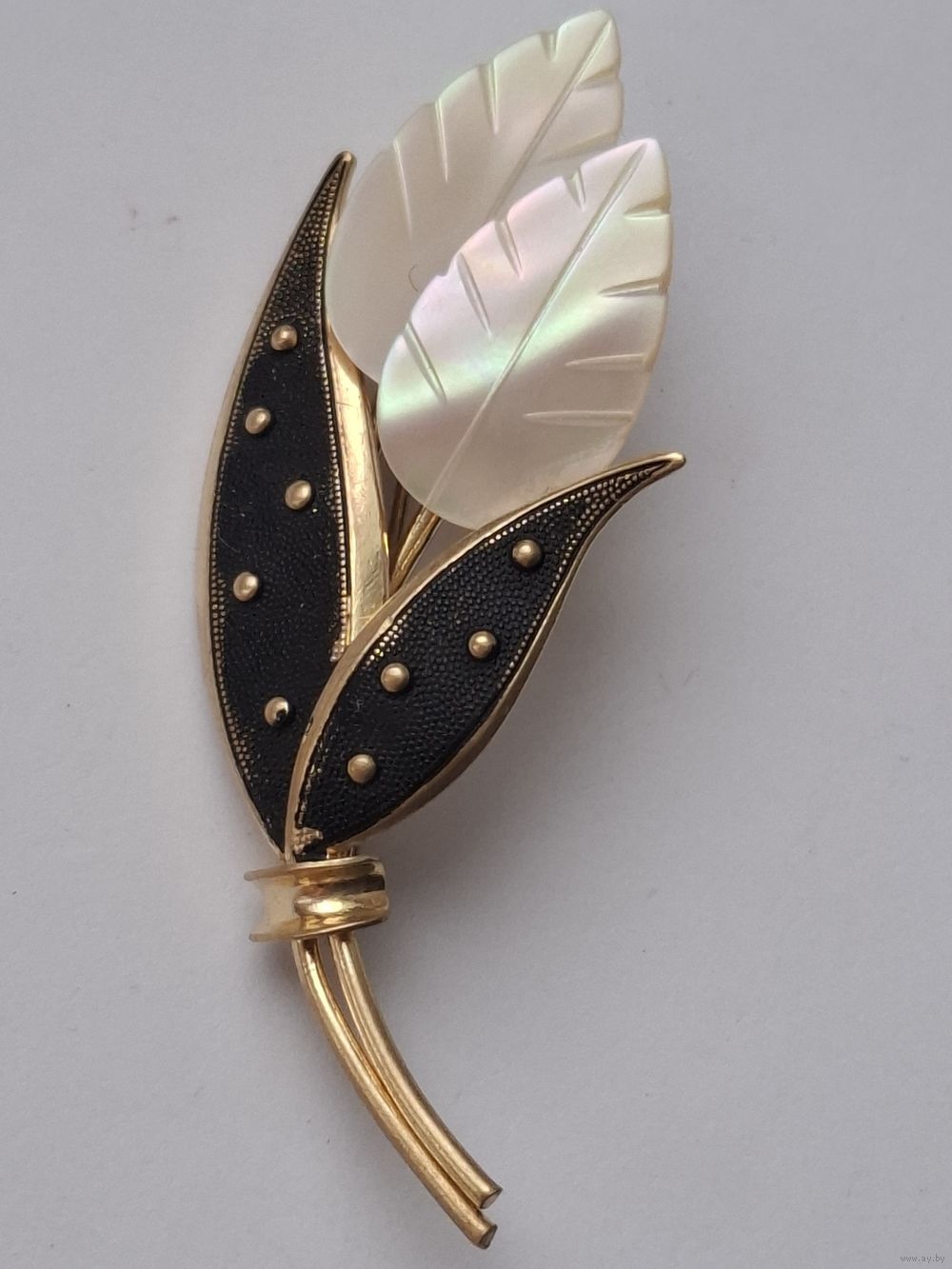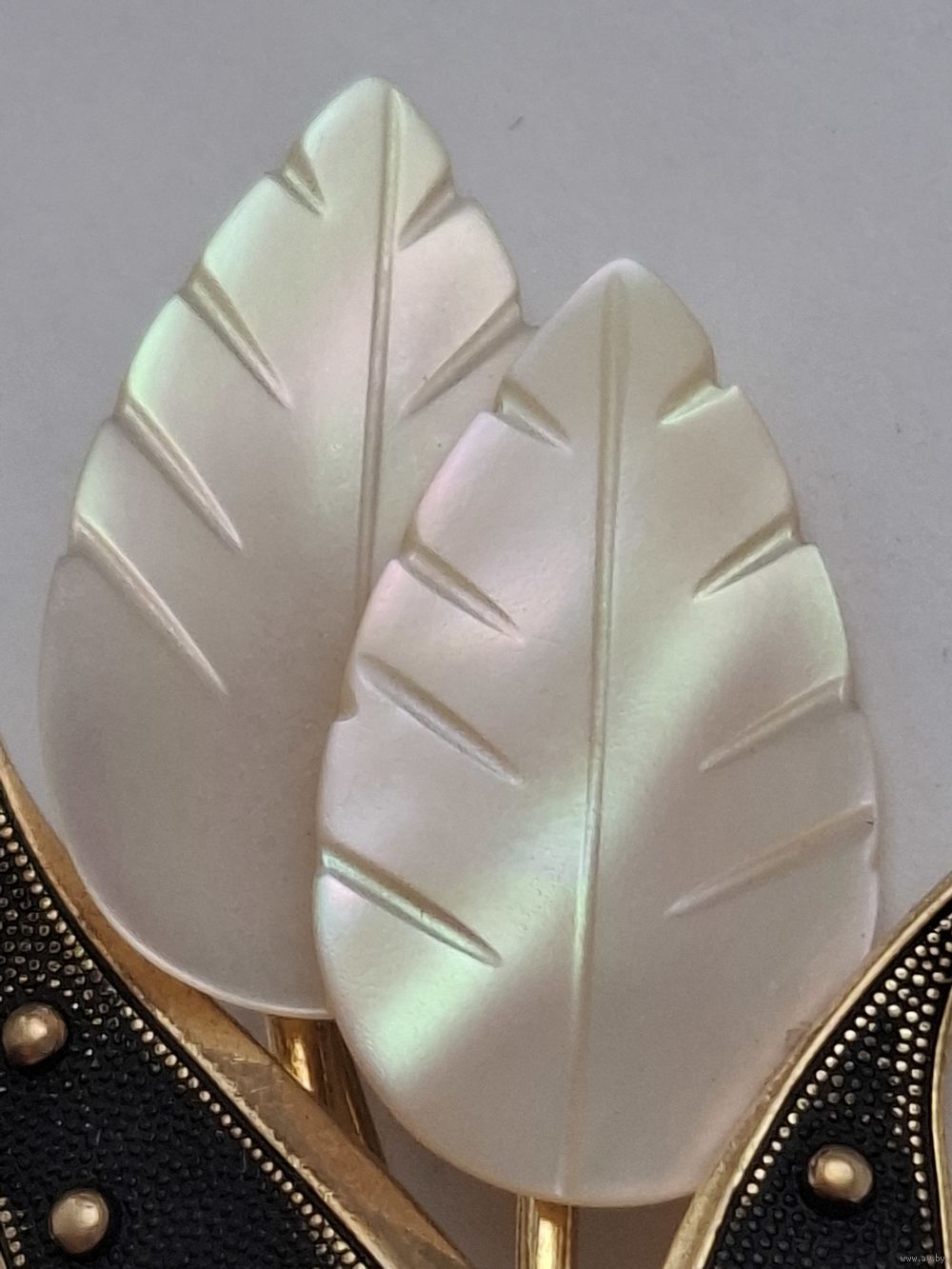 Брошь. Листики. Натуральный перламутр. Позолота.