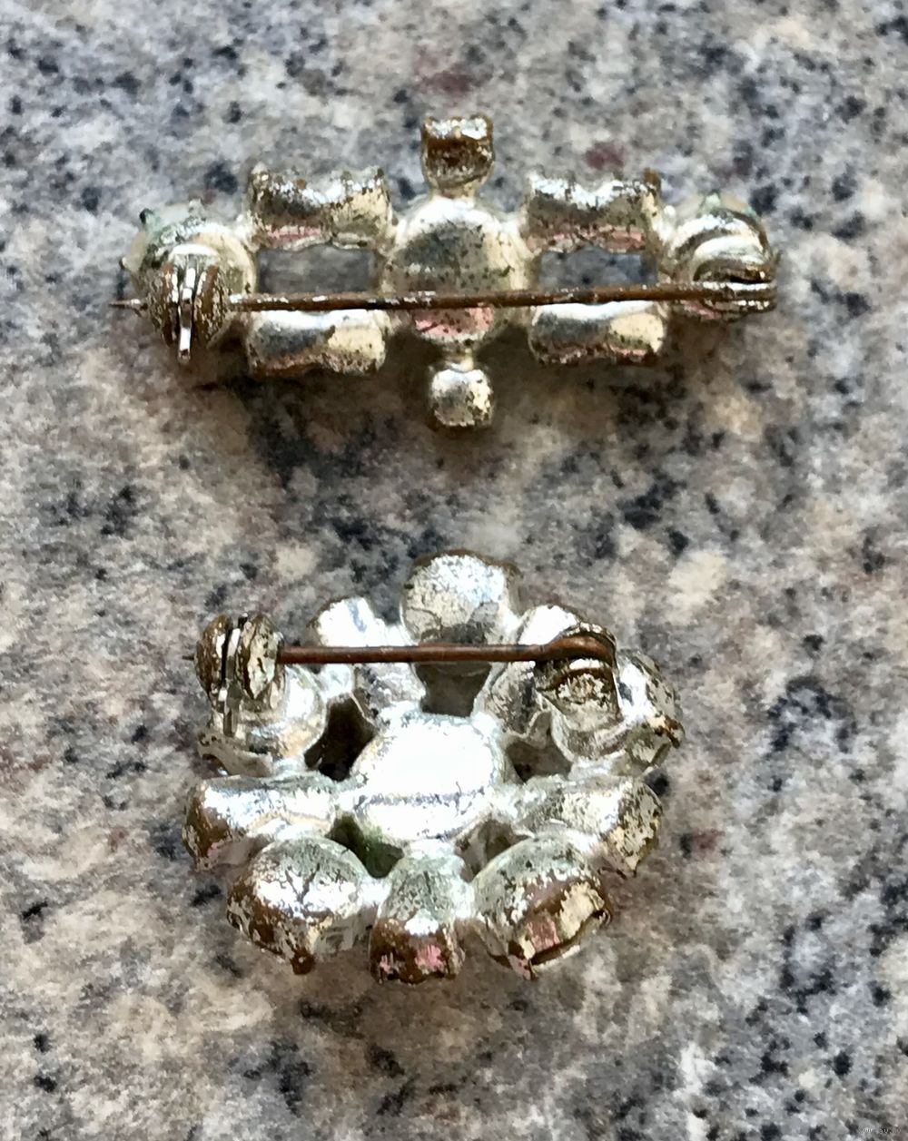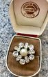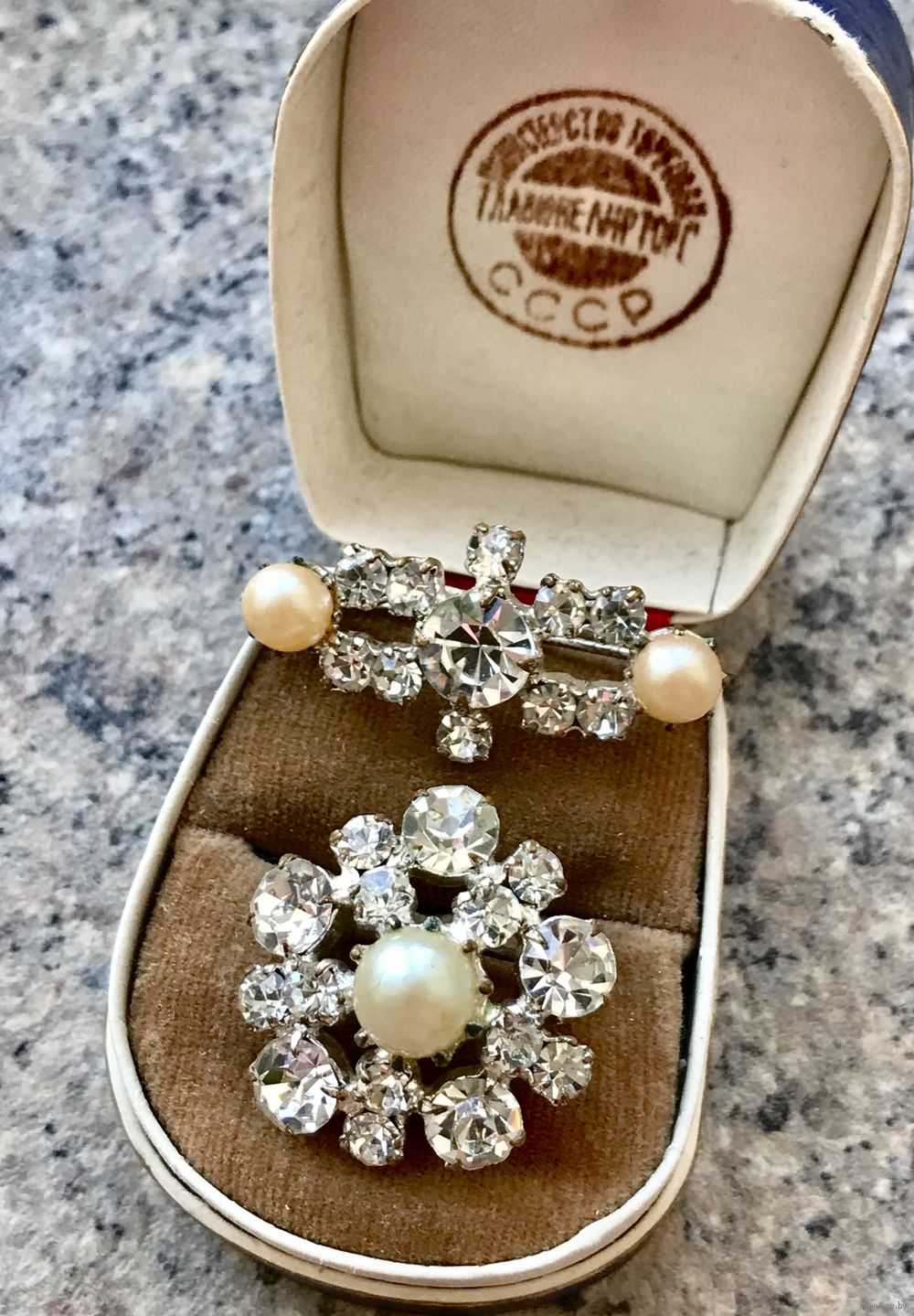 Лот из двух небольших чешских брошек 1970-х годов. Изготовлены из латуни, вставки из чешского стекла и бусин под жемчуг. Размер первой 3х1,5 см., диаметр второй 2,3см.