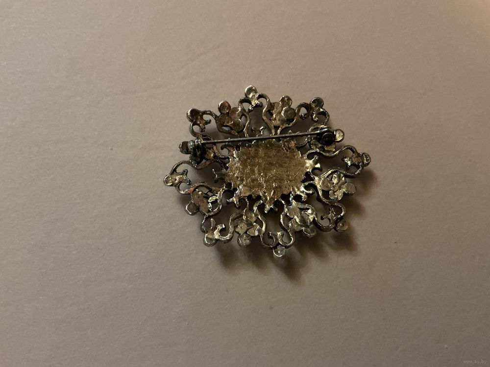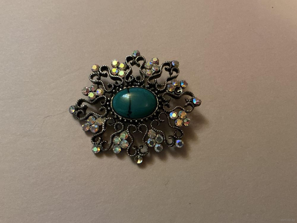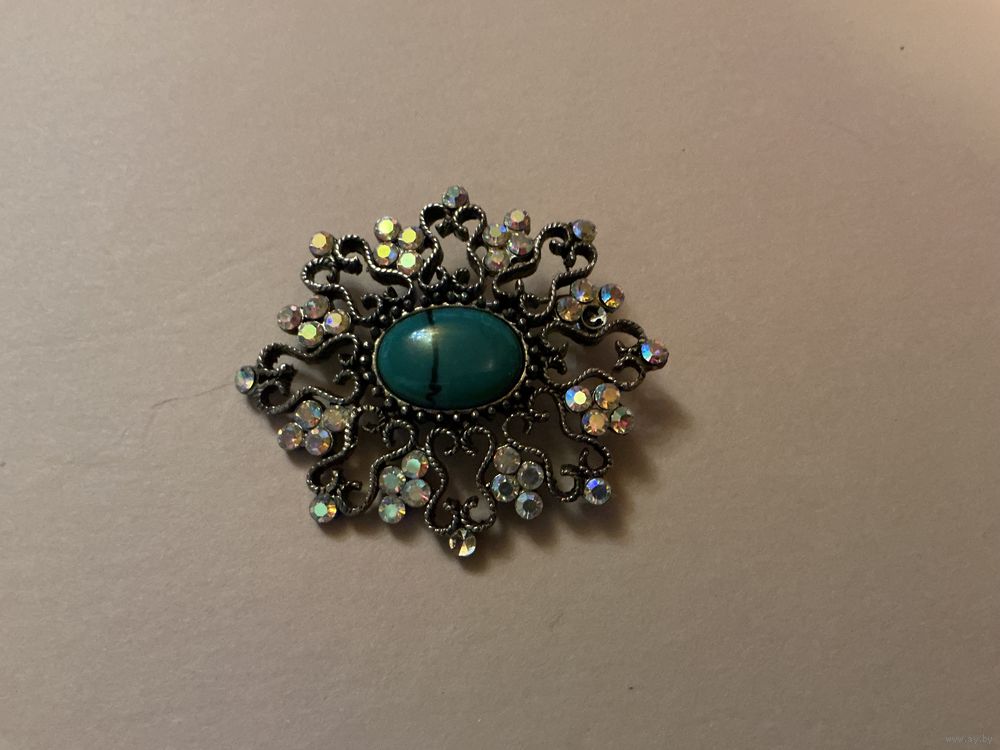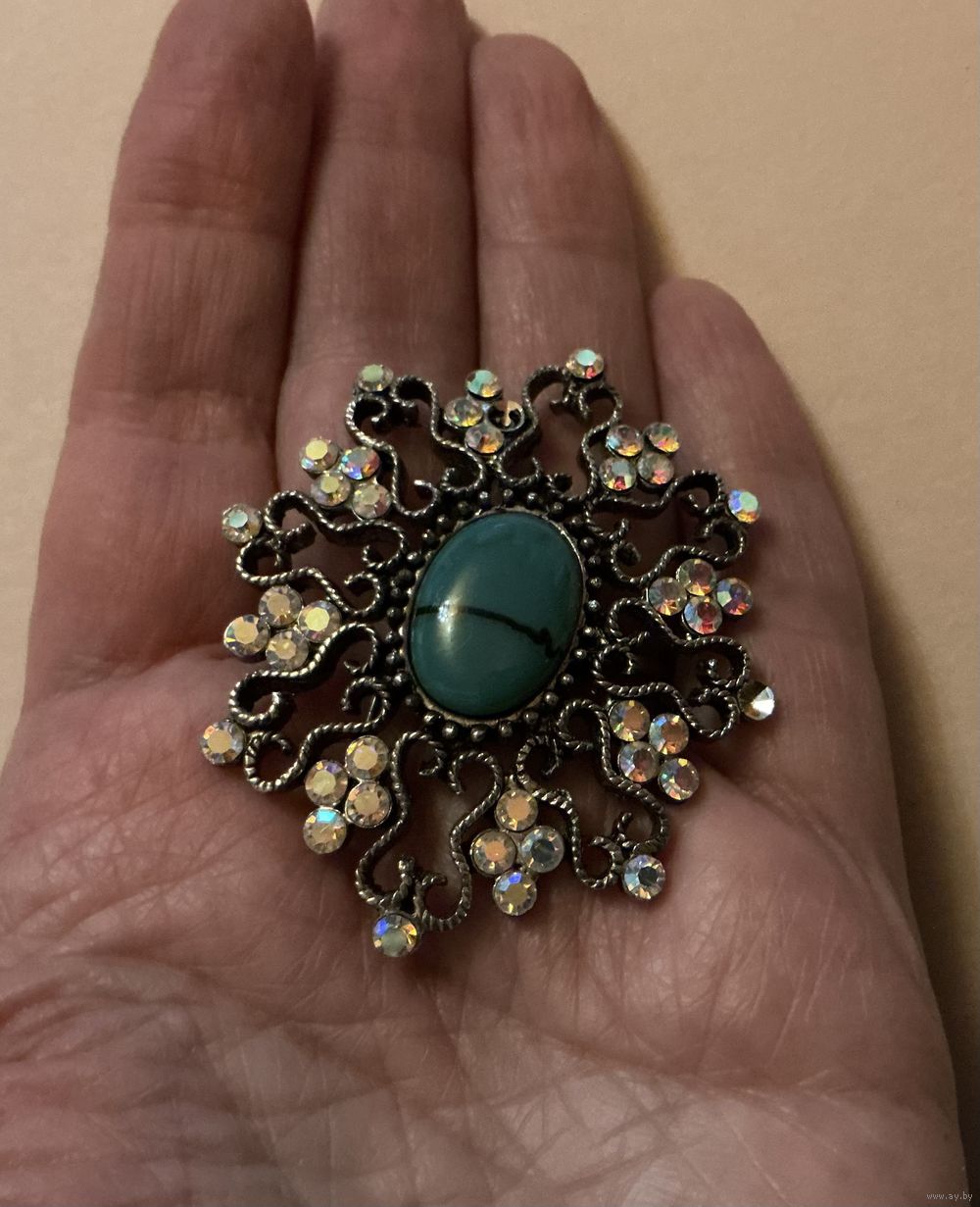 Красивая крупная брошь , центр под бирюзу , две стразы нехватает, постараюсь найти ,5,5 см х 4,5 см