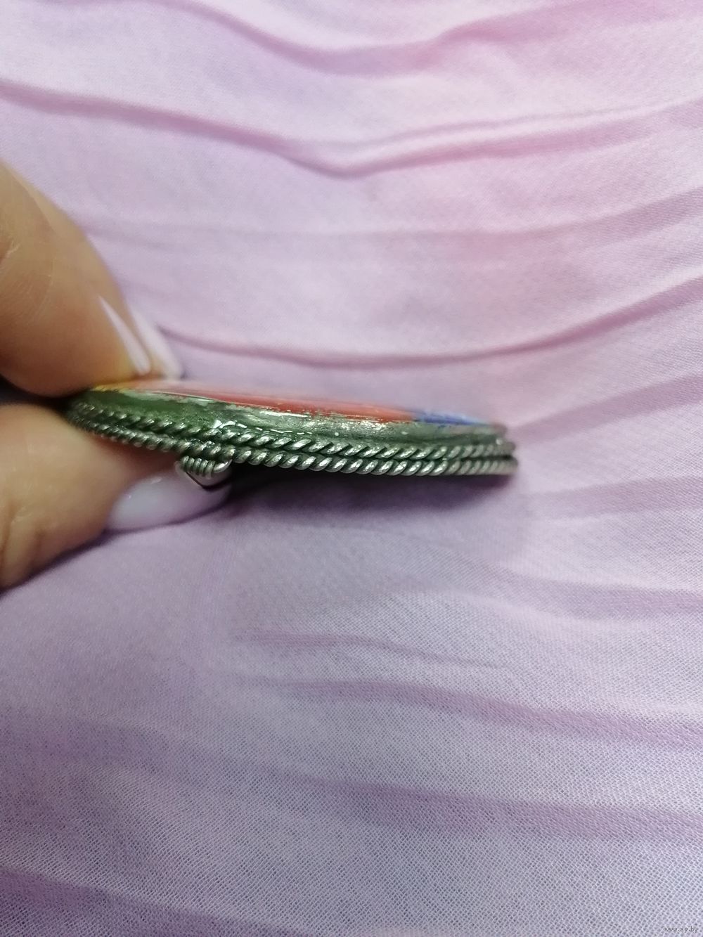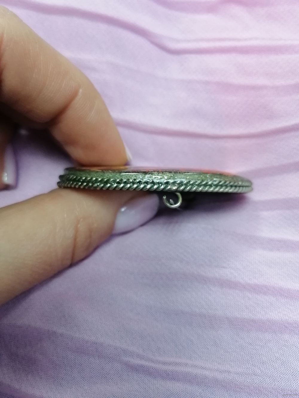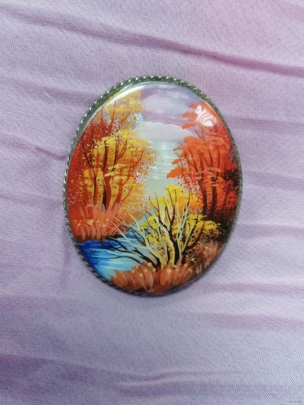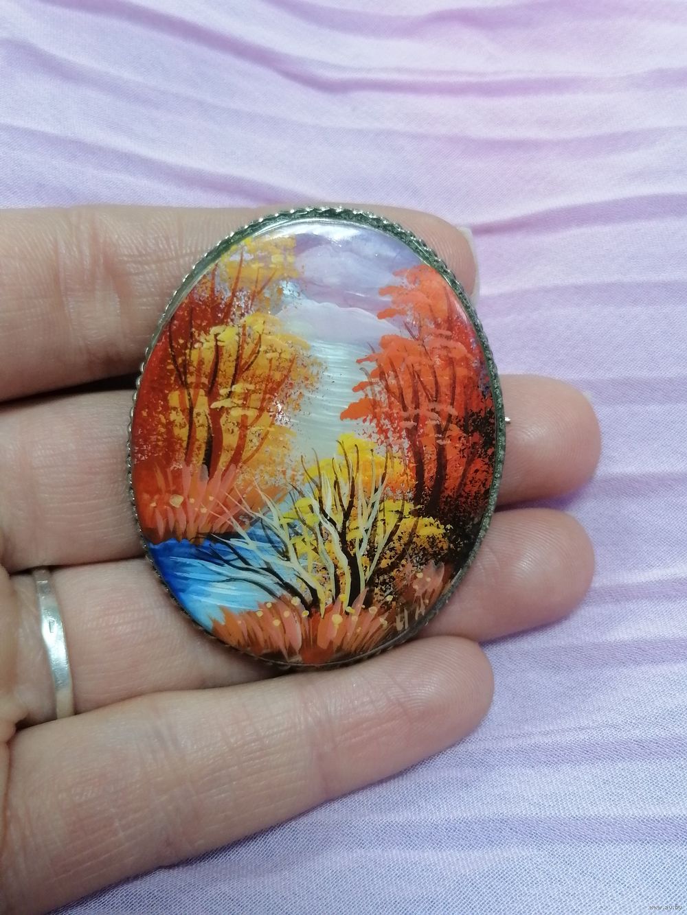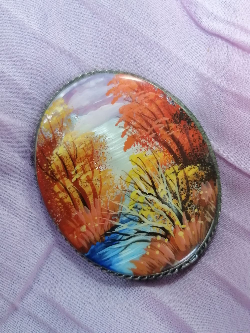 Художественная роспись на ракушке в мельхиоровой оправе. Осенние мотивы, подпись автора. Полностью ручная работа. 5см х 4см.