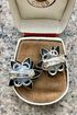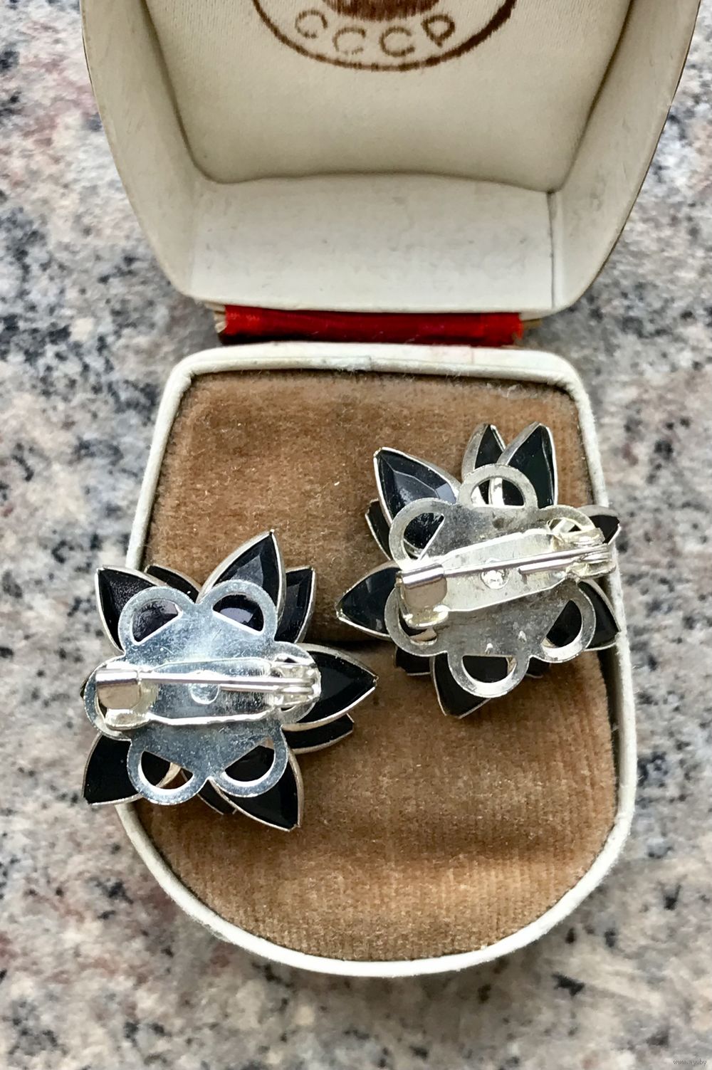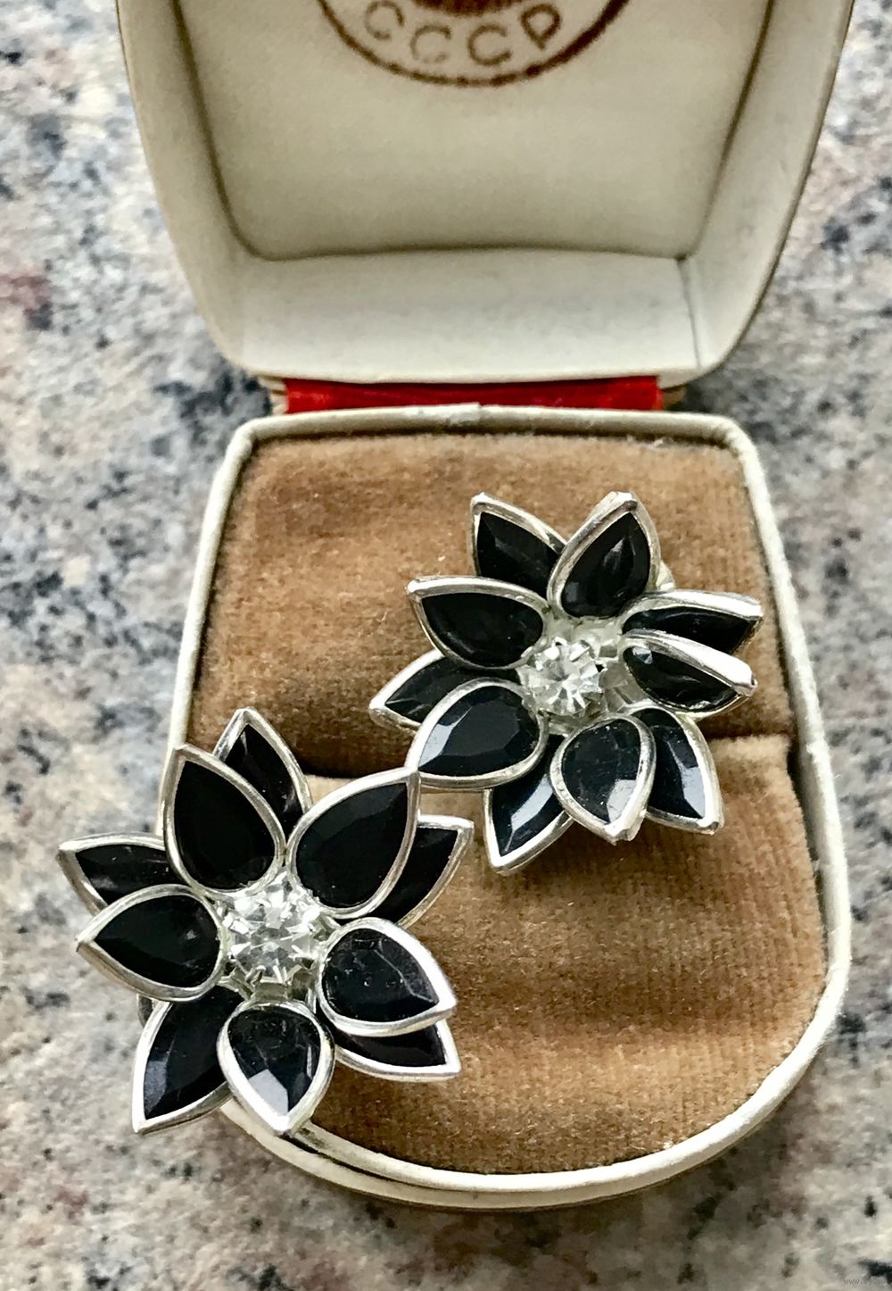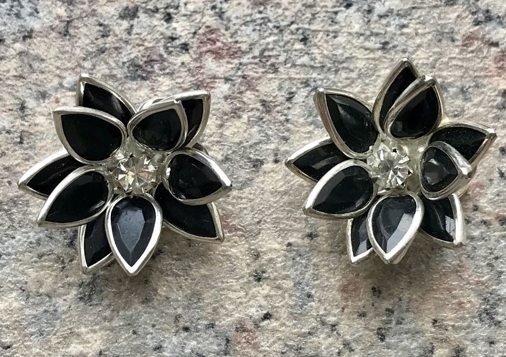 Лот из двух небольших брошек. Чёрные вставки из пластика в оправе безель, в центре кристаллик. Диаметр цветка 2,3см. Состояние хорошее. Цена указана за пару.