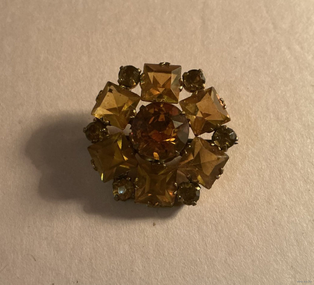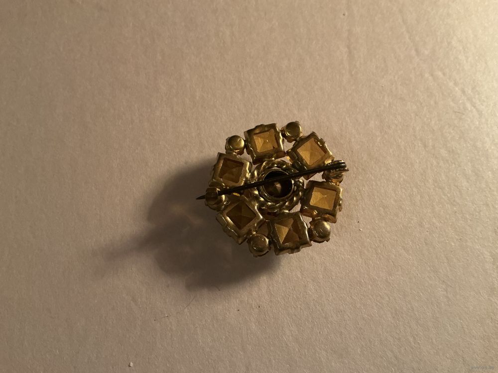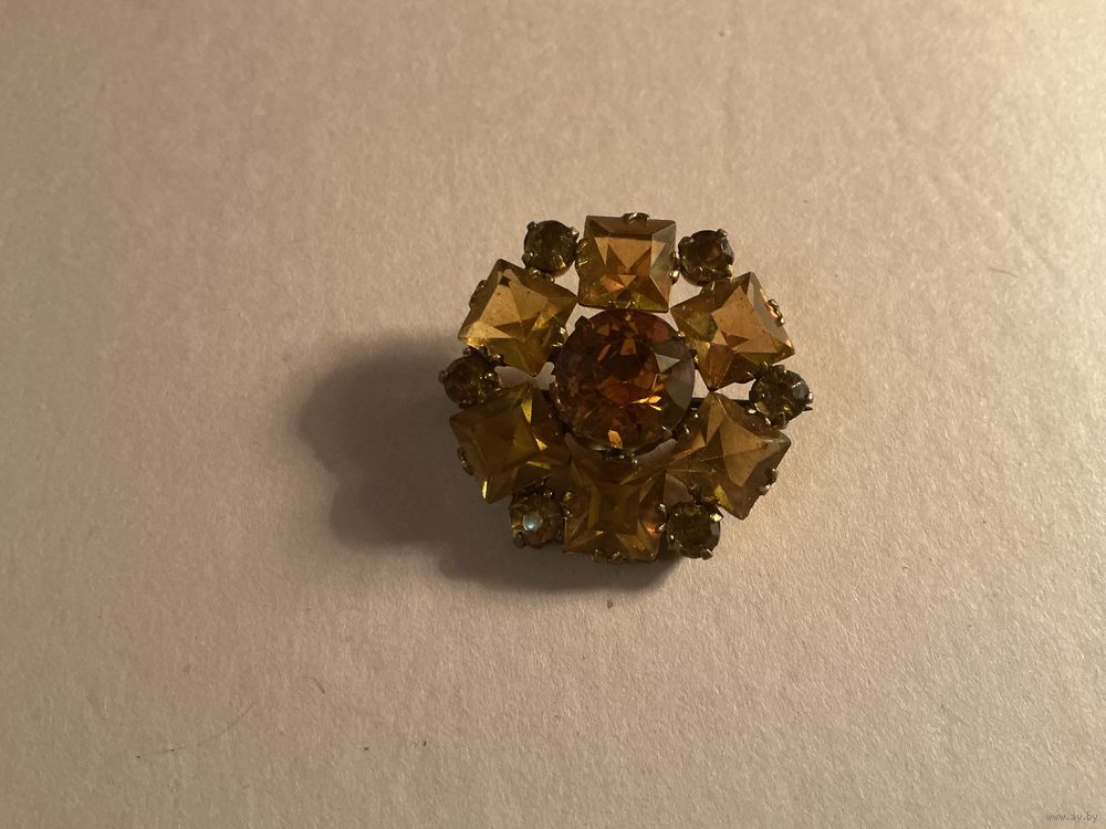 Брошь цитриновое стекло , редкая , застёжка старого типа С- образная, диаметр 3 см