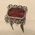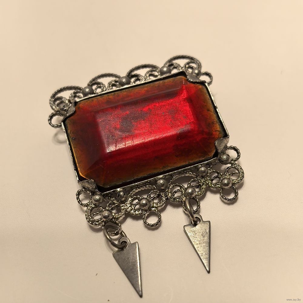 Необычная ажурная брошь красным прямоугольный кабашоном. Утрачено две подвески и игла. Требуется ремонт.