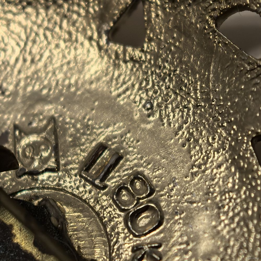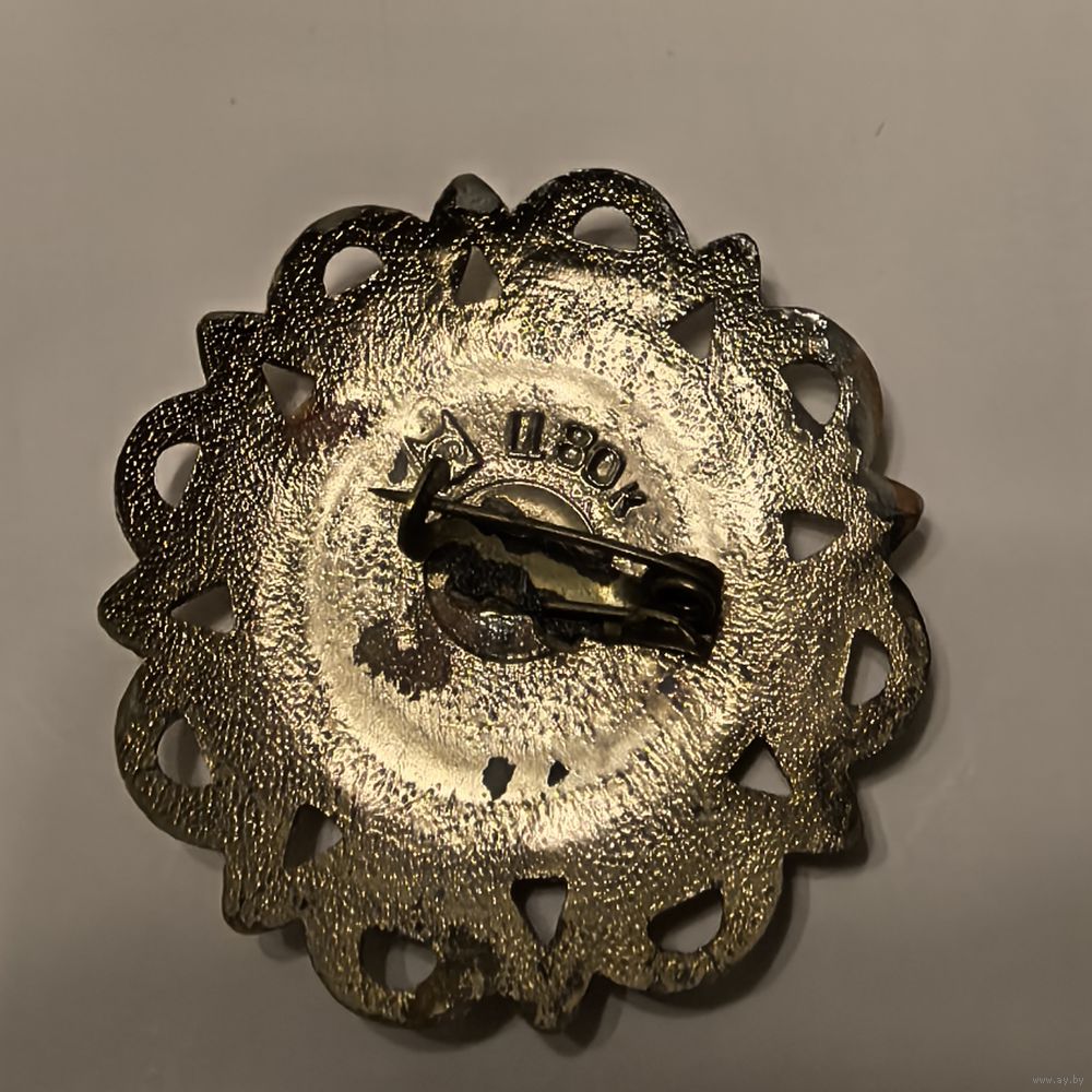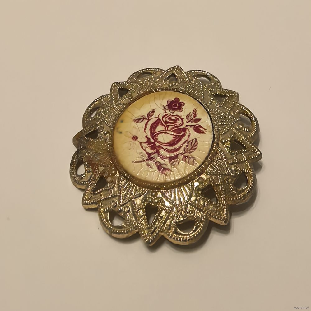Брошь с покрытием и розой. Есть клеймо. Есть потери покрытия. Старый лак дал эффект кракелюра.