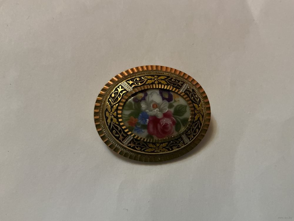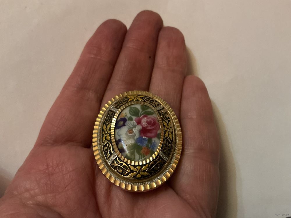 Красивая брошь вставка фарфор деколь с подрисовкой , 4,5 см х 3,5 см , как новая