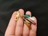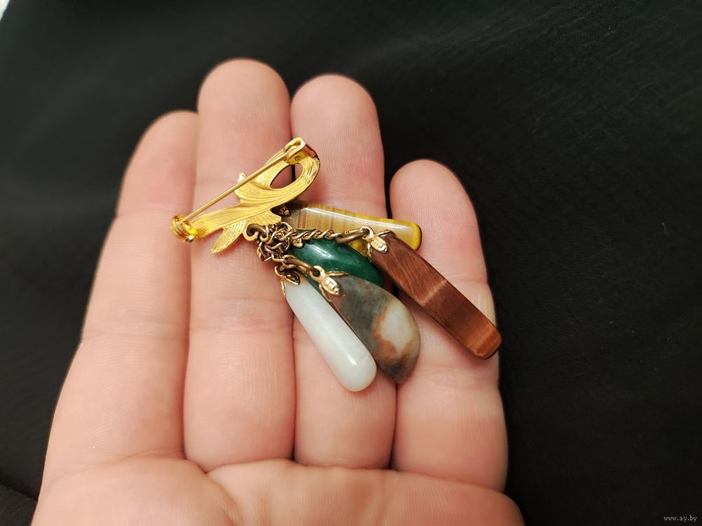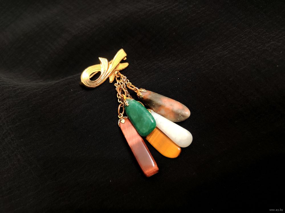 Брошь, представляет собой винтажное бижутерное изделие, выполненное в виде золотистого банта или узла, от которого на цепочках свисают пять подвесок в форме капель и прямоугольников из разноцветных полированных камней.