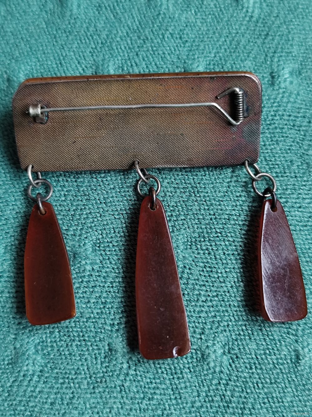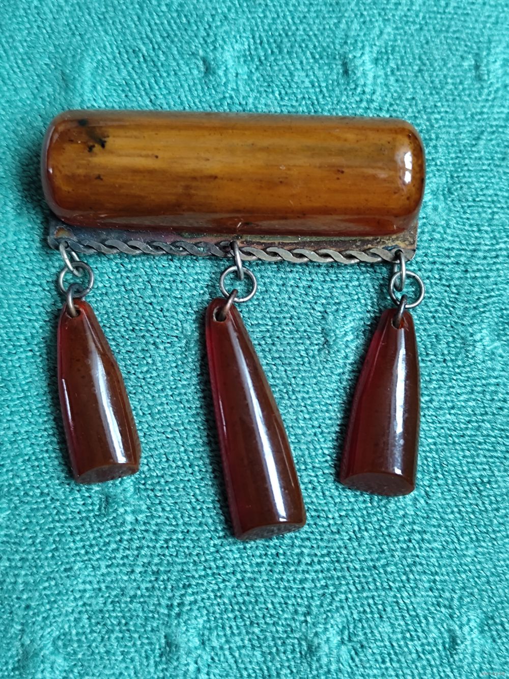 Брошь крашеный янтарный пресс с 3 подвесками- 52*25(планка) и от 25 мм до 33 мм подвески.