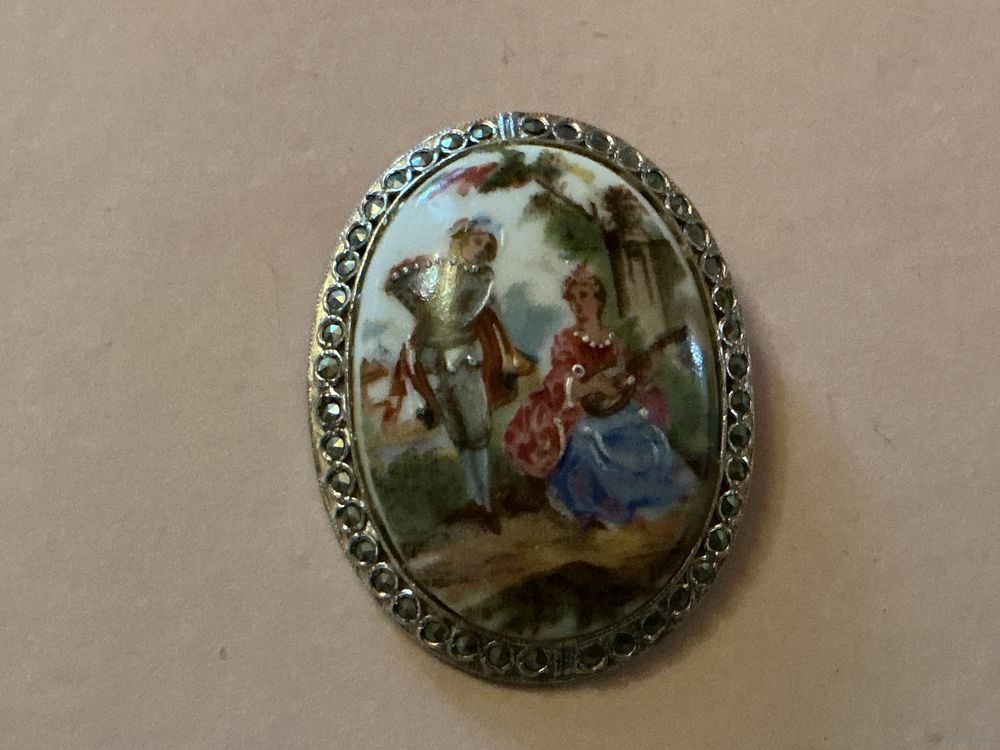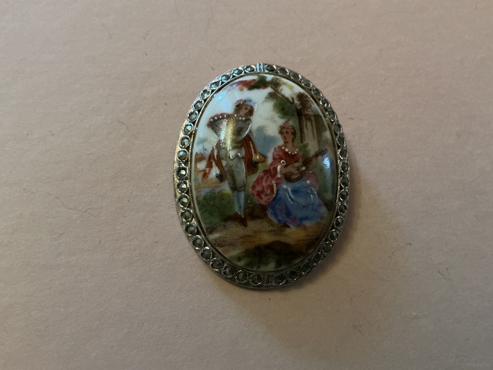 Большая красивая брошь фарфор Лимож , редкая оправа под серебро с марказитами ,5 см х 3,8 см, отличный подарок