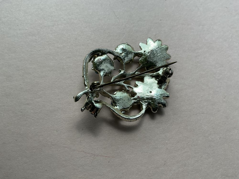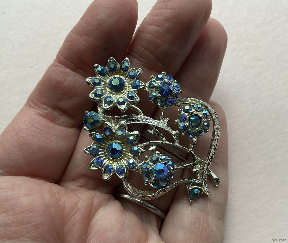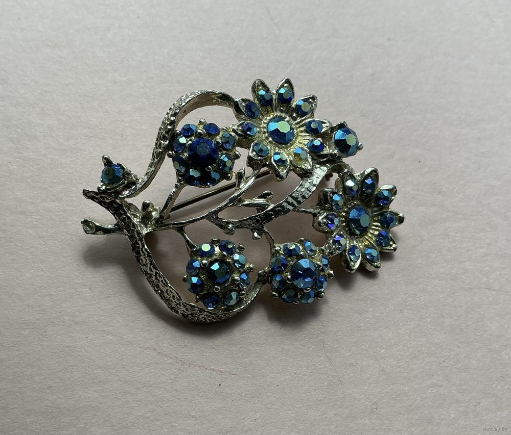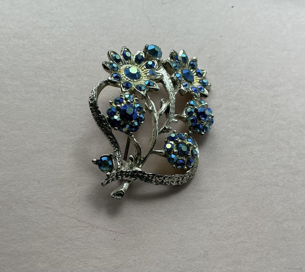 Красивая старинная брошь , вставки синее стекло Аврора Бореалис, металл под серебро, 5,5 см х 4 см
