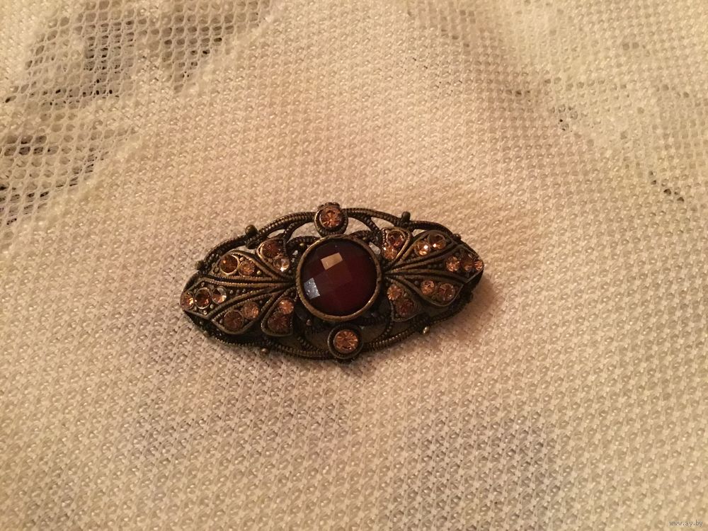 Красивая винтажная брошь, 4,5 см х 2,3 см, металл под бронзу, литая, коньячные стразу, нет двух мелких, незаметно