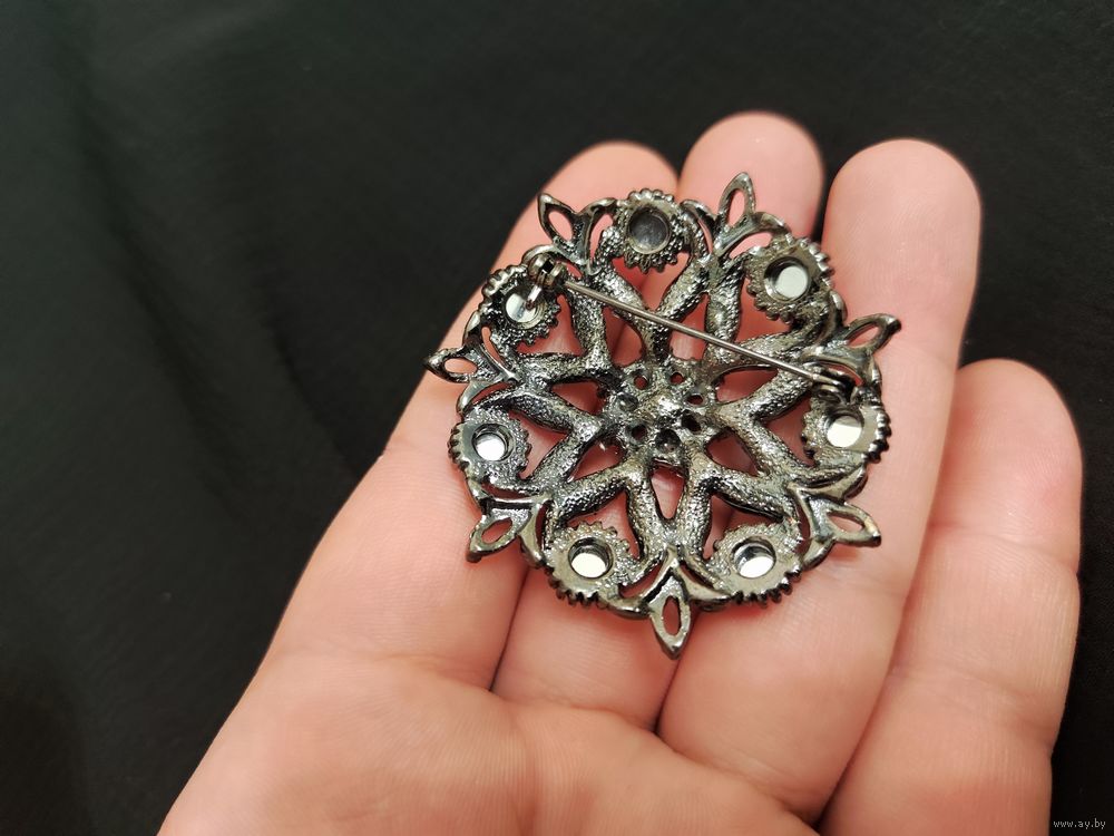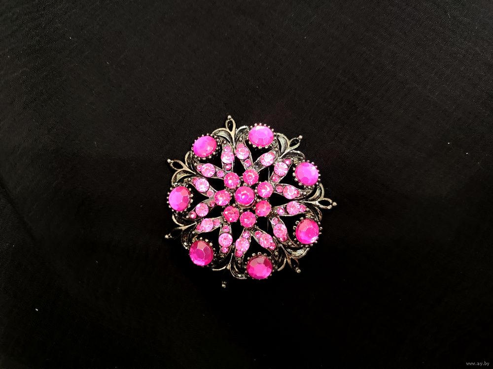 Брошь под античную сталь, стразы (стекло) насыщенного розового цвета фуксии различных форм и размеров, закрепленные вставками