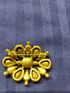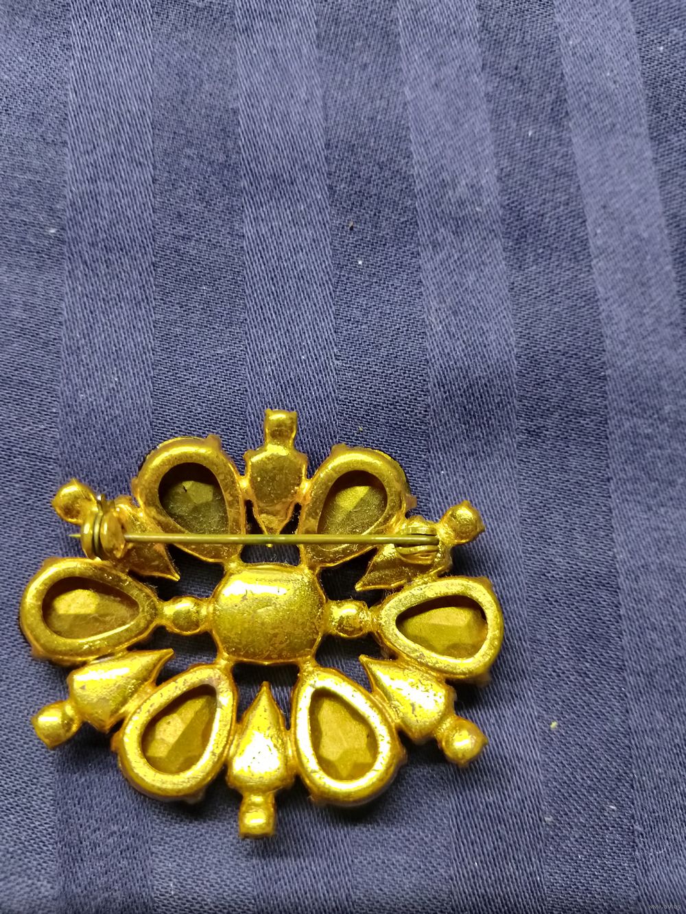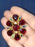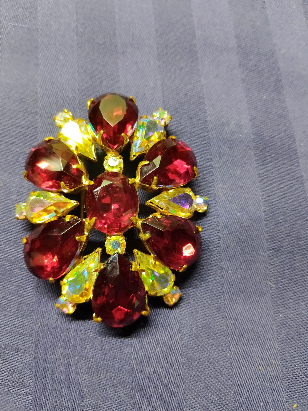 Брошь выполнена в форме цветка. Она украшена красными и переливающимися желтовато-зелеными стразами (кристаллами) в оправе золотистого цвета. Изделие выполнено из бижутерного сплава с покрытием золотистого цвета. Вставки представляют собой стразы или граненое стекло, некоторые из которых имеют покрытие Aurora Borealis (АВ), придающее им радужный блеск. Камни закреплены при помощи крапановой закрепки (prong set).