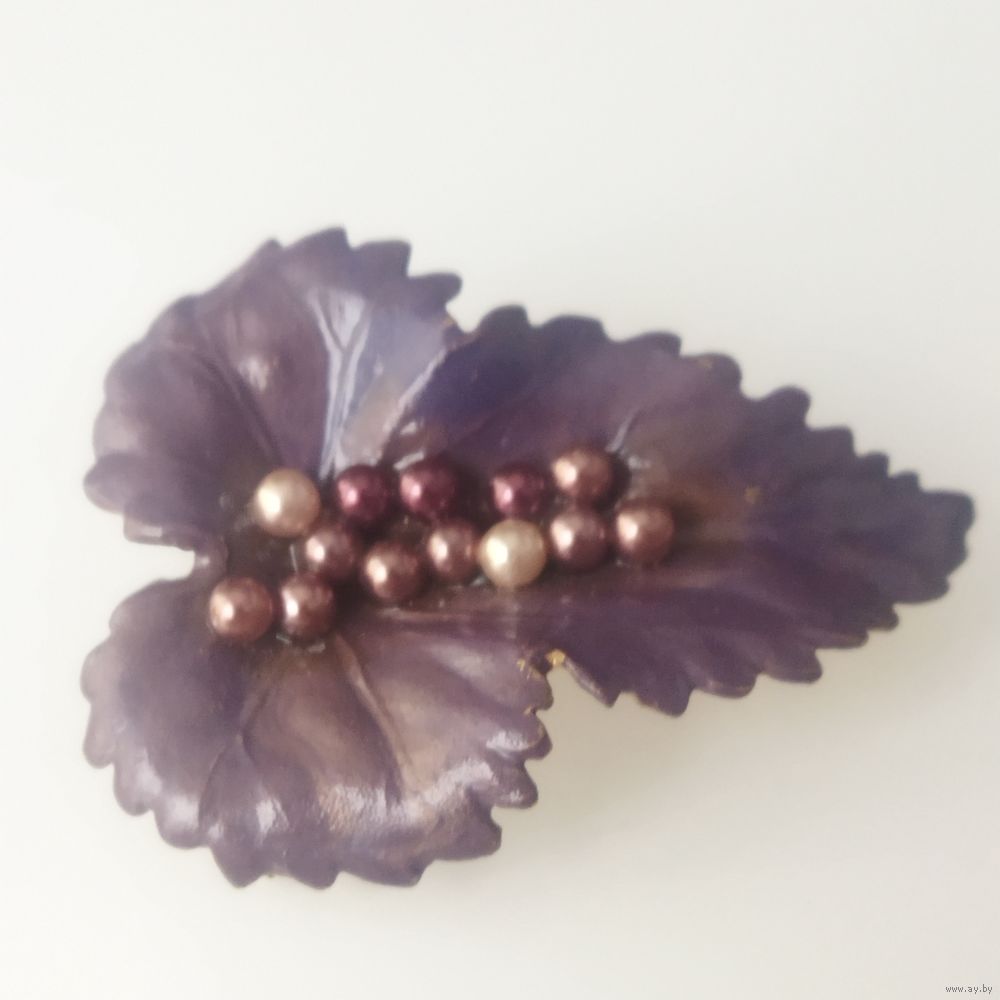 Брошь винтажная немецкая " Виноград" в технике " живой, объемный лист" Латунь. Эмаль. Жемчужинки. 5х3,8 см.