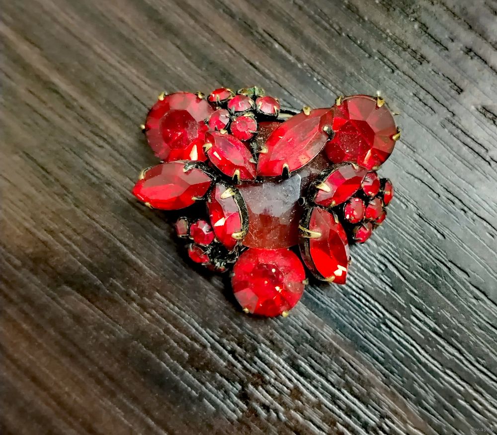 Брошь состоит из множества красных кристаллов разной формы ( круглые, овальные , маркиз ) в металлической оправе , Стиль Советская эпоха , Чехословакия , Яблонекс .