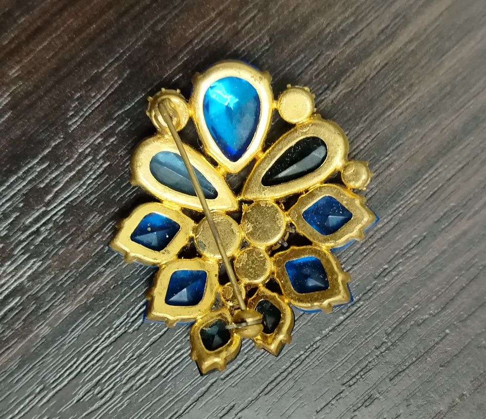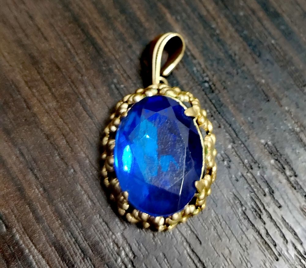Подвеска выполнена в стиле модер с крупным синим кристаллом , оправленным в металле с декоративным узором , размеры 2 на 2 см , вес 4,6 грамм .