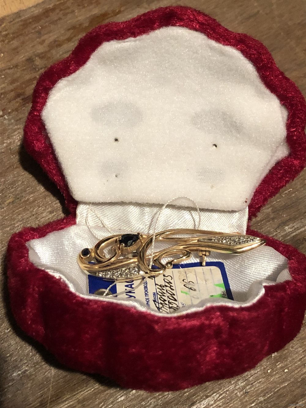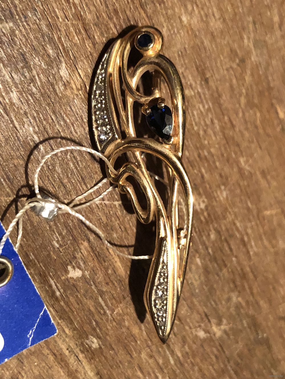 Вес изделия из золота 585 пробы с бриллиантами 6,6 грамм, также украшена сапфирами. Все на фото. Могу выслать.