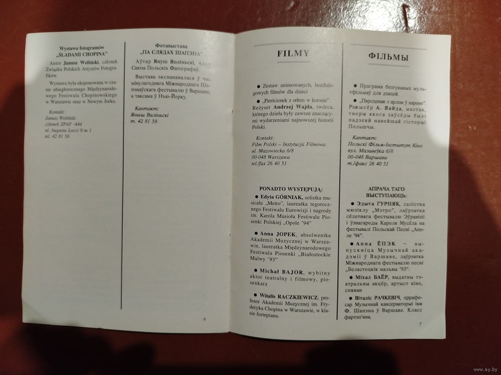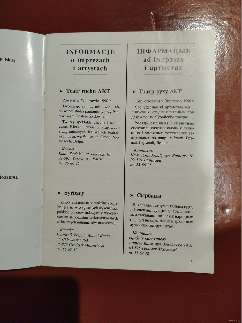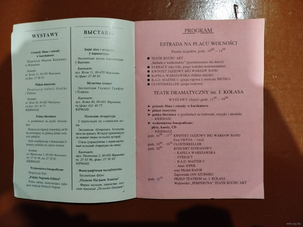 1. Свидетельство эпохи: 1994 год – время становления новых государств, культурного диалога и поиска идентичности. Брошюра прекрасно передает дух того времени: сотрудничество Польши и Беларуси, афиша, объединяющая народный фольклор («Сырбацы»), джаз (Big Warsaw Band), рок (Closterkeller) и новый для того времени рэп (B.A.D. Master C из легендарного мюзикла «Метро»).