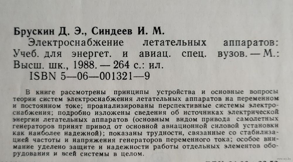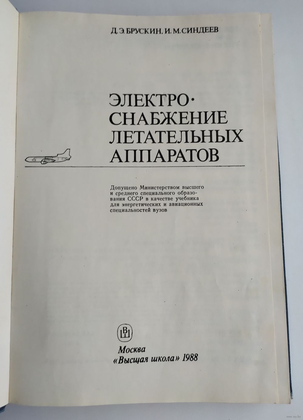 Брускин Д.Э., Синдеев И.М. Электроснабжение летательных аппаратов. Учебное пособие. М.: Высшая школа, 1988г., 264 с., с илл. Твёрдый переплёт, обычный формат. (ISBN: 5-06-001321-9 / 5060013219)