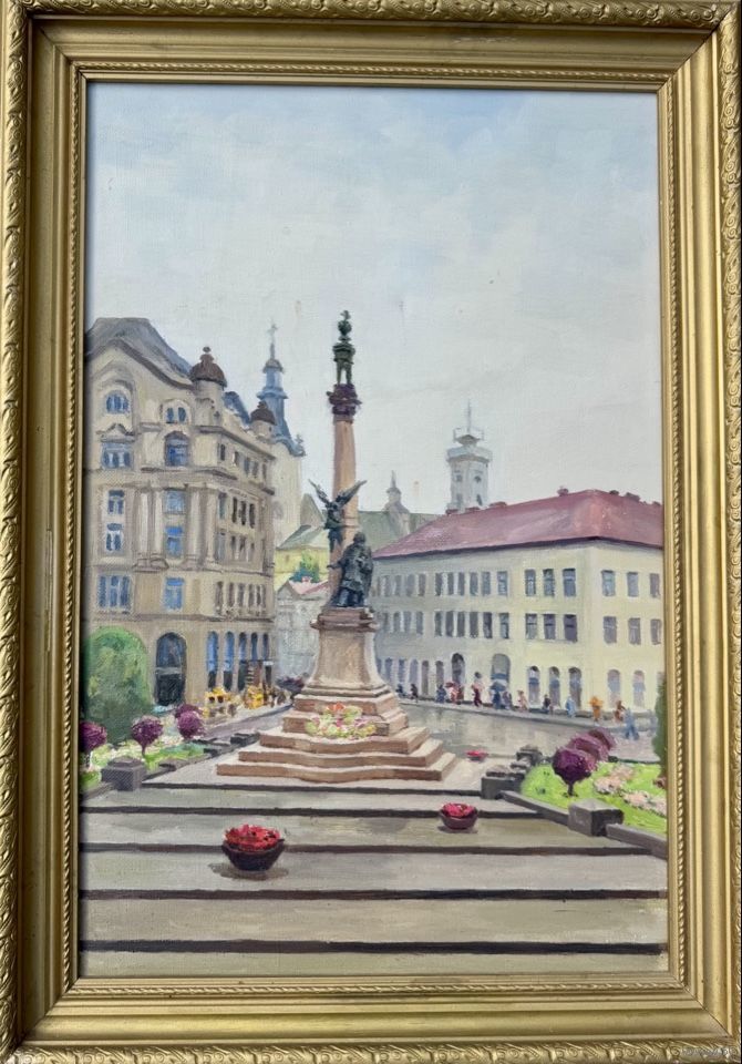 Бржозовский Г.Ф "Дождливый день". Памятник А.Мицкевичу во Львове. Холст, масло. Размер с рамой 52х73,5 см.