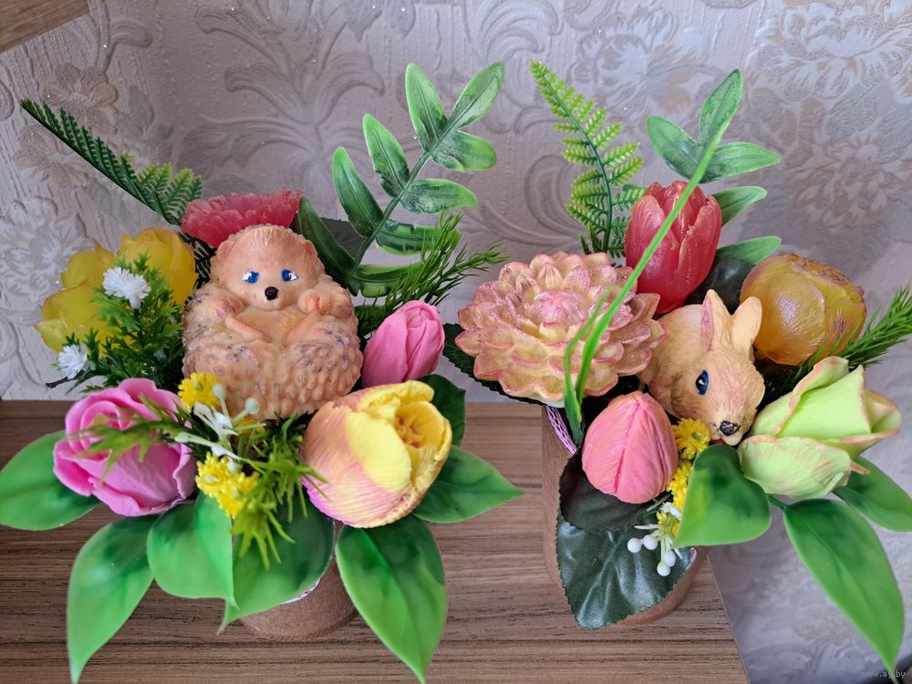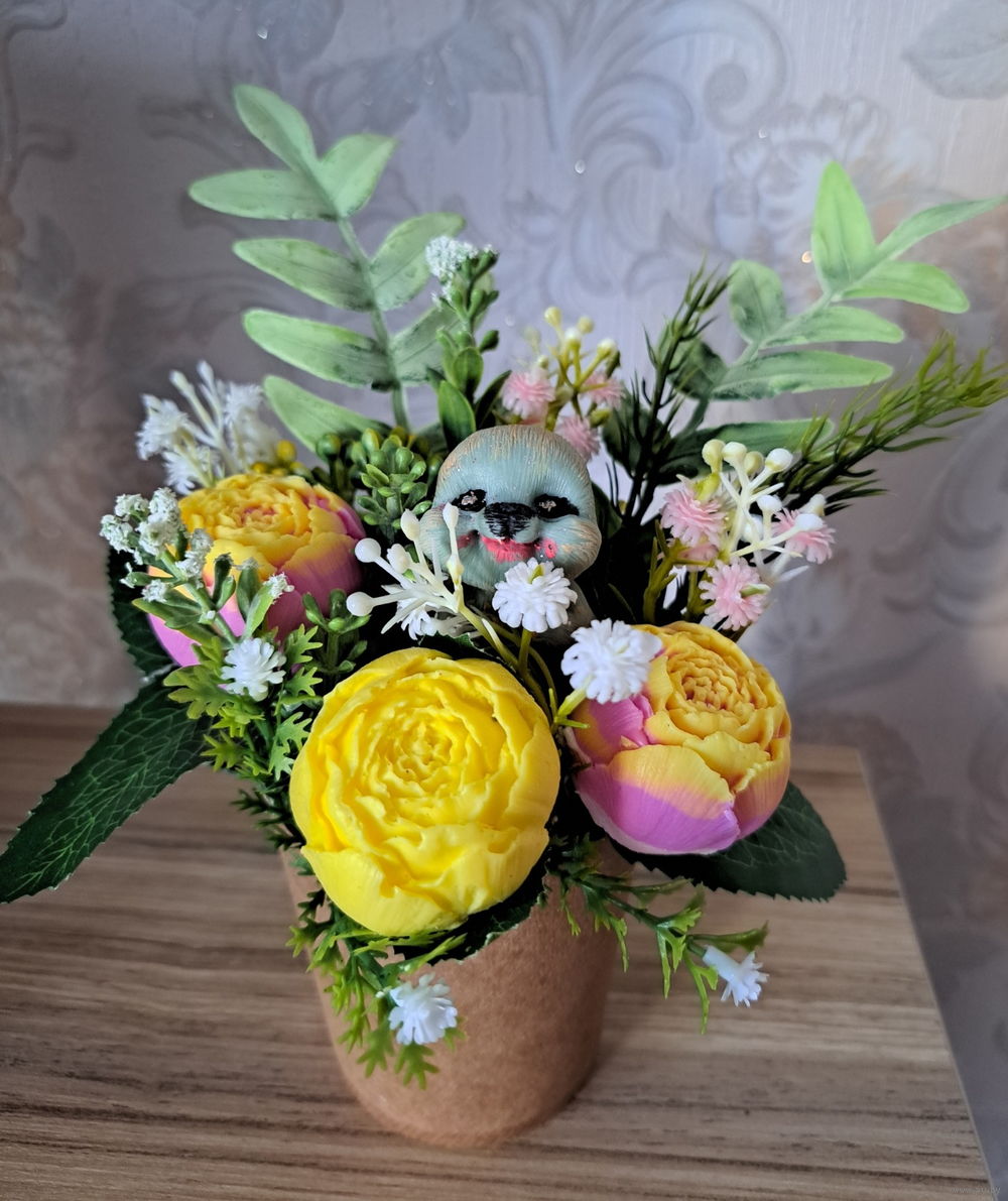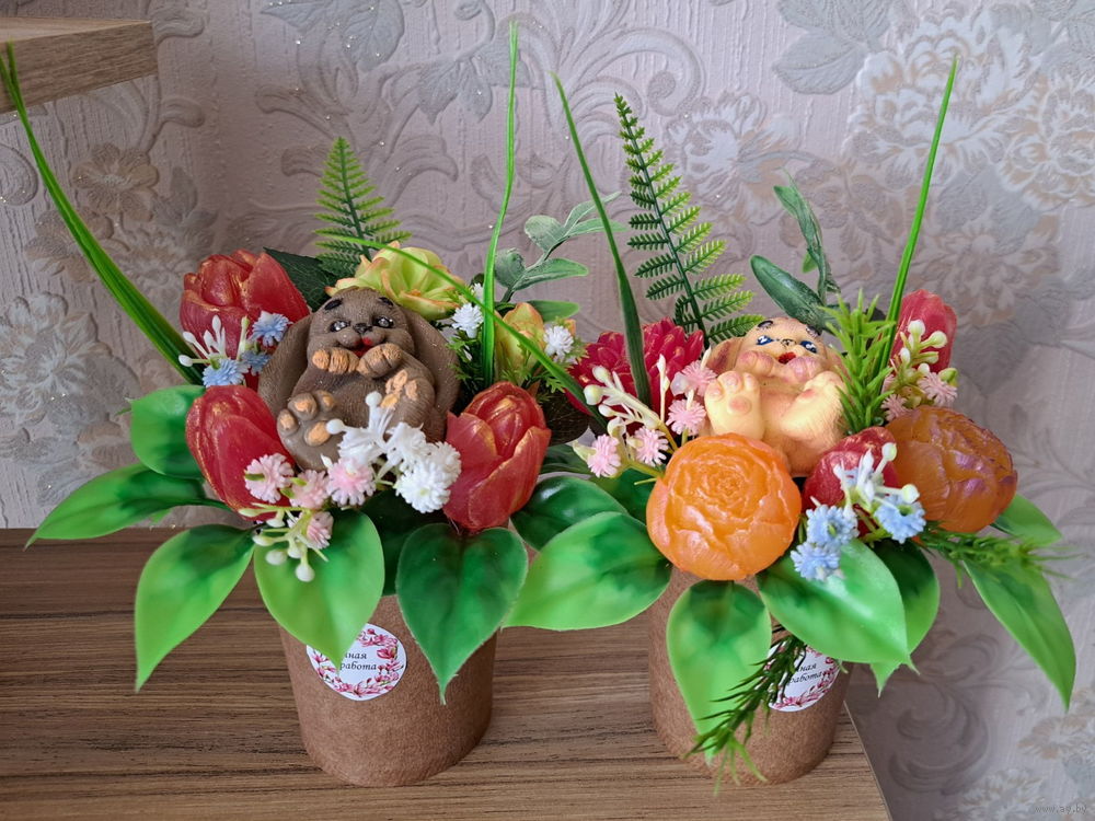 Букеты из мыльных цветов. Мыльные цветы – это идеальное решение для тех, кто ценит практичность и красоту, ведь розы на мыльной основе не отличить от живых цветов. Мыло имеет нежный цветочный аромат. Букет из мыльных цветов можно использовать как декор для дома, квартиры, дачи, офиса. Букеты могут немного отличаться от фото, но не критично.