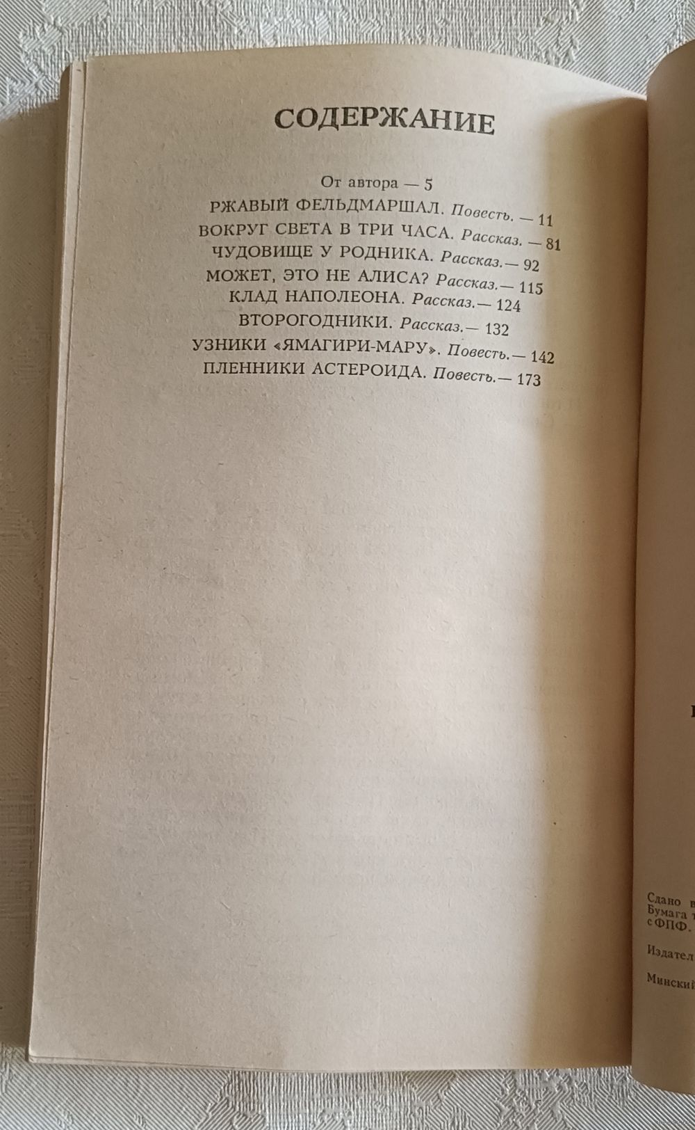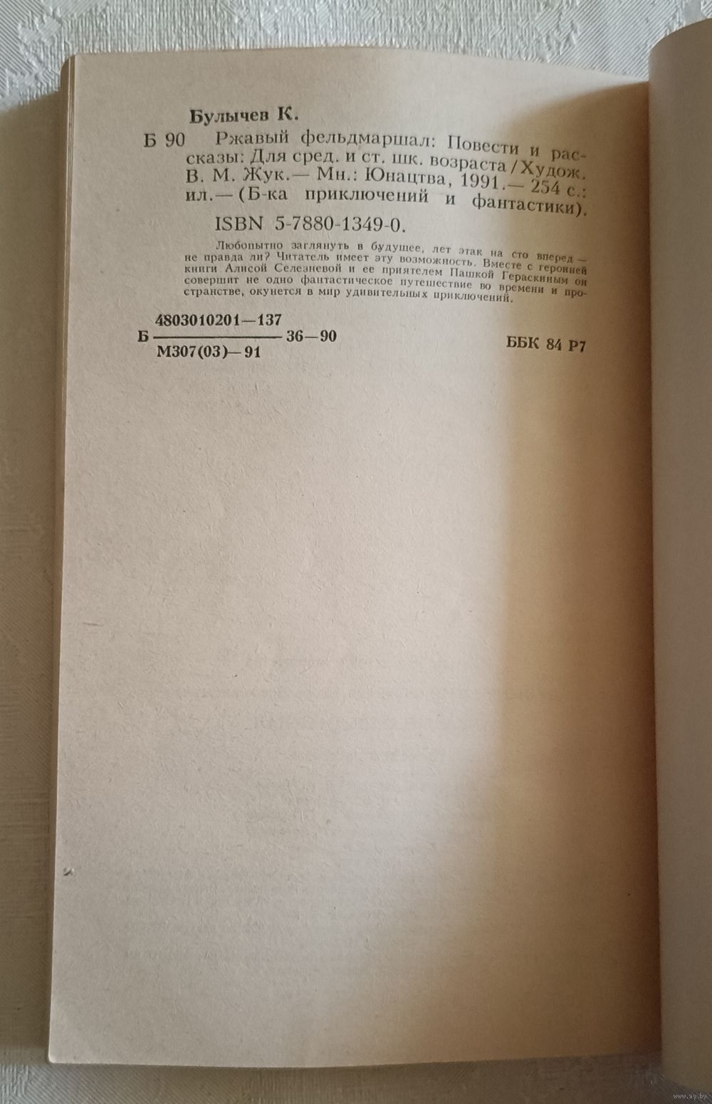 Булычев Кир. Ржавый фельдмаршал: Повести и рассказы: Для сред. и ст. шк. возраста /Худож. В. М. Жук.- Мн.: Юнацтва, 1991.- 254 с.: ил. - (Б-ка приключений и фантастики), мягкая обложка, обычный формат.