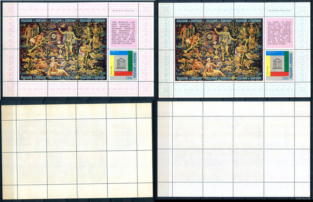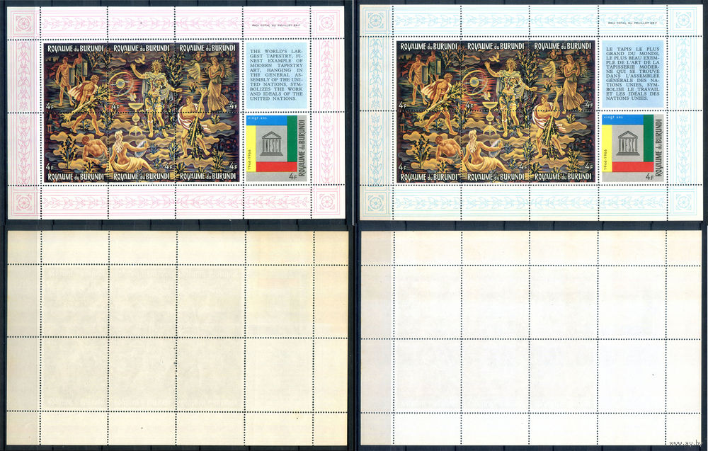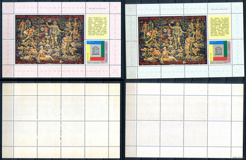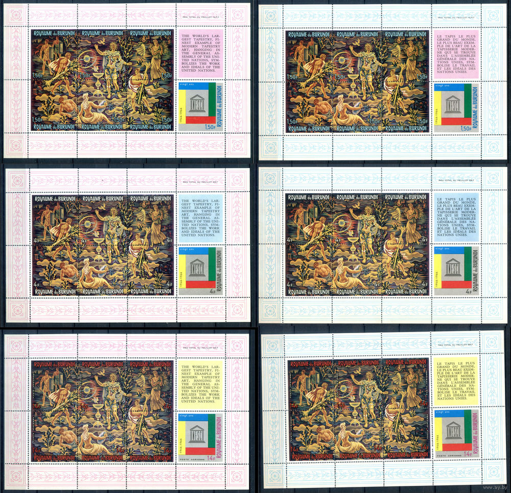 Бурунди - 1966г. - 20 лет ЮНЕСКО, живопись, художник Жан Лурса - 6 блоков - полная серия, MNH с лёгким пожелтением клея, 1 блок с отпечатками на клее, 1 с маленьким повреждением клея, 1 лист с маленькой точкой-пятнышком на лицевой стороне (на поле сверху) [Mi bl. 11 A - bl. 16 A]. #3-Bu-Z-2-25