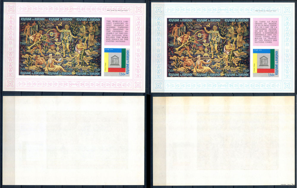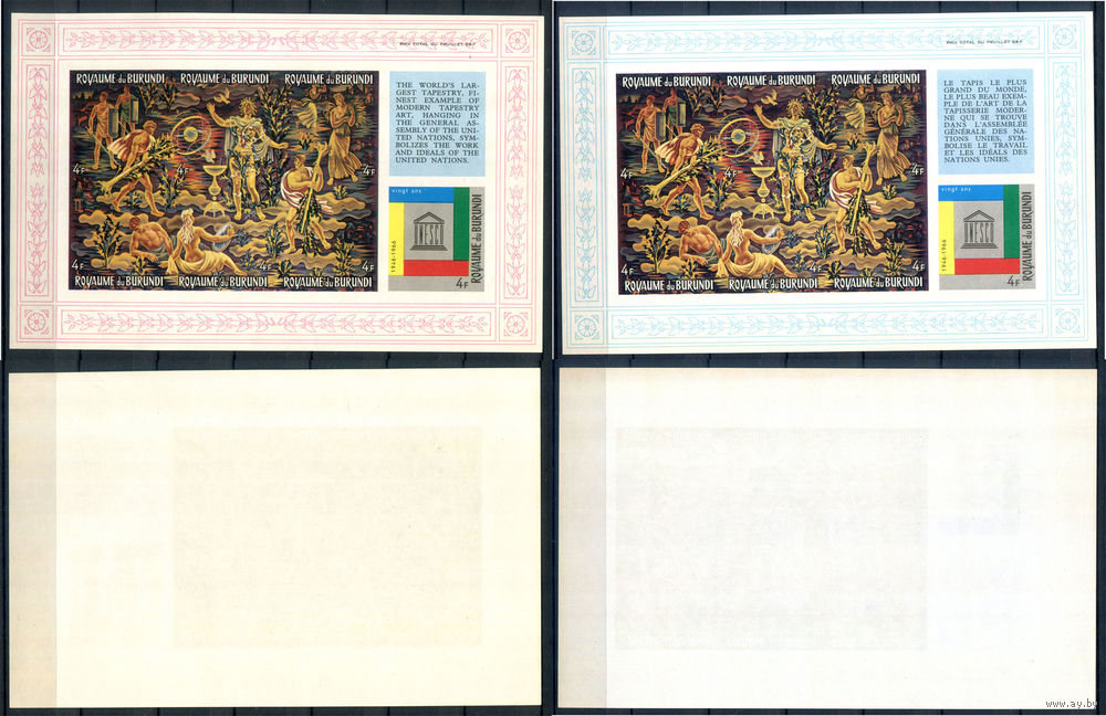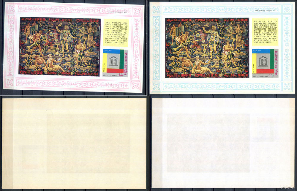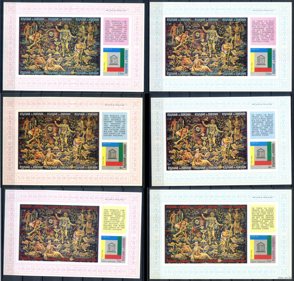 Бурунди - 1966г. - 20 лет ЮНЕСКО, живопись, художник Жан Лурса - 6 блоков - полная серия, MNH с небольшим пожелтением клея и отпечатками на клее, 3 блока с полосами на клее, 1 с маленькой точкой-пятнышком на лицевой стороне [Mi bl. 11 B - bl. 16 B]. #3-Bu-Z-2-26
