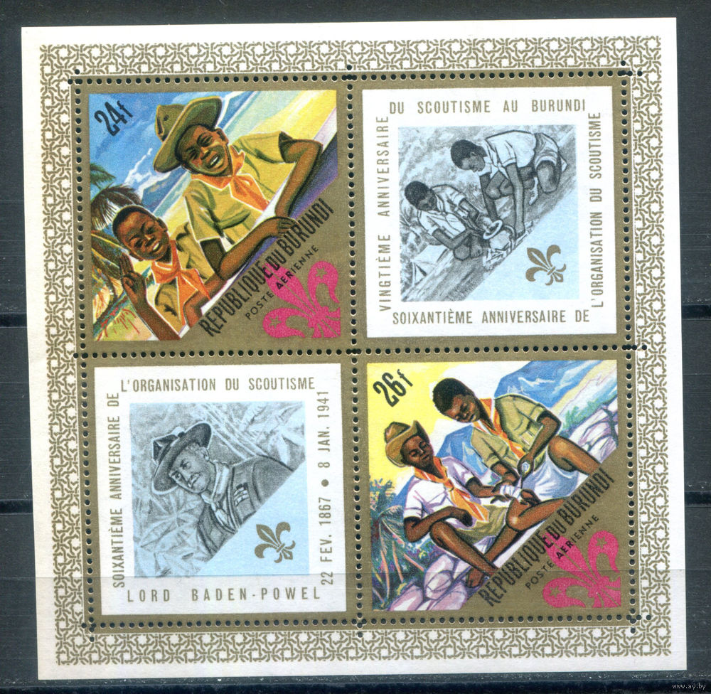Бурунди - 1968г. - 60 лет скаутскому движению, 12-я международная встреча скаутов. Авиапочта - 1 блок - полная серия, MNH, лёгкое пожелтение на клее и лицевой стороне [Mi bl. 25 A]. #3-Bu-Z-2-23