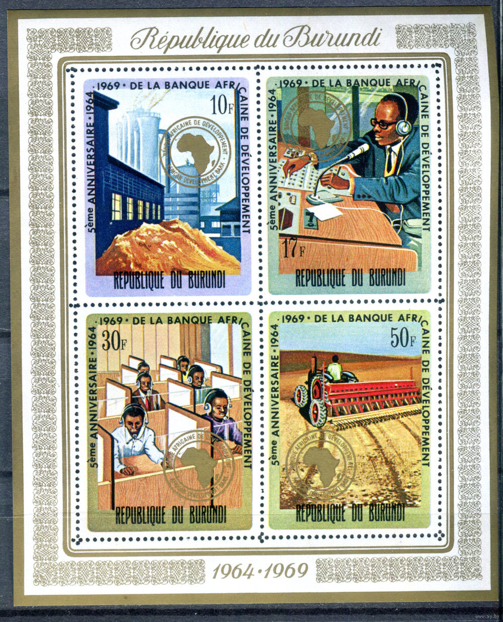 Бурунди - 1969г. - 5 лет африканскому банку развития - 1 блок - полная серия, MNH с маленькой потёртостью-повреждением клея [Mi bl. 34 A]. #3-Bu-Z-2-17