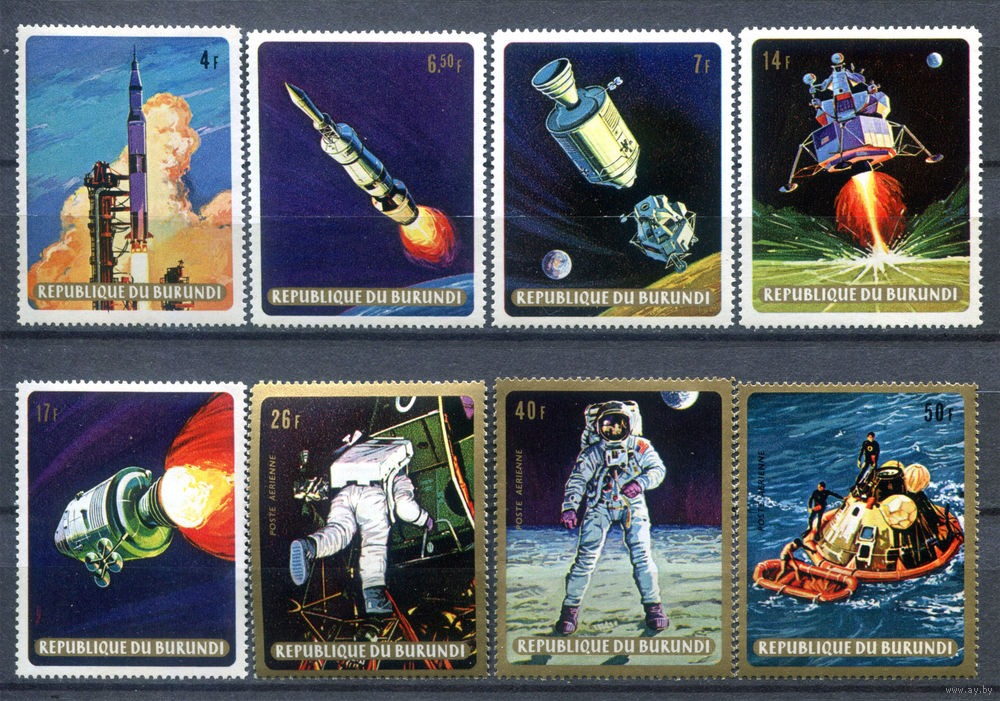 Бурунди - 1969г. - первый пилотируемый полёт на луну - 8 марок - полная серия, MNH с небольшим пожелтением клея, номинал 4 с маленьким повреждением клея, 2 марки с отпечатками на клее [Mi 520 A - 527 A]. #3-Bu-Z-1-21