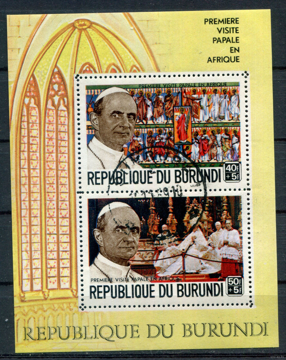 Бурунди - 1969г. - визит папы Павла VI в Афирку - 1 блок - полная серия, гашёный с жёлтыми полосами на клее [Mi bl. 35 A]. #3-Bu-77-KB-1