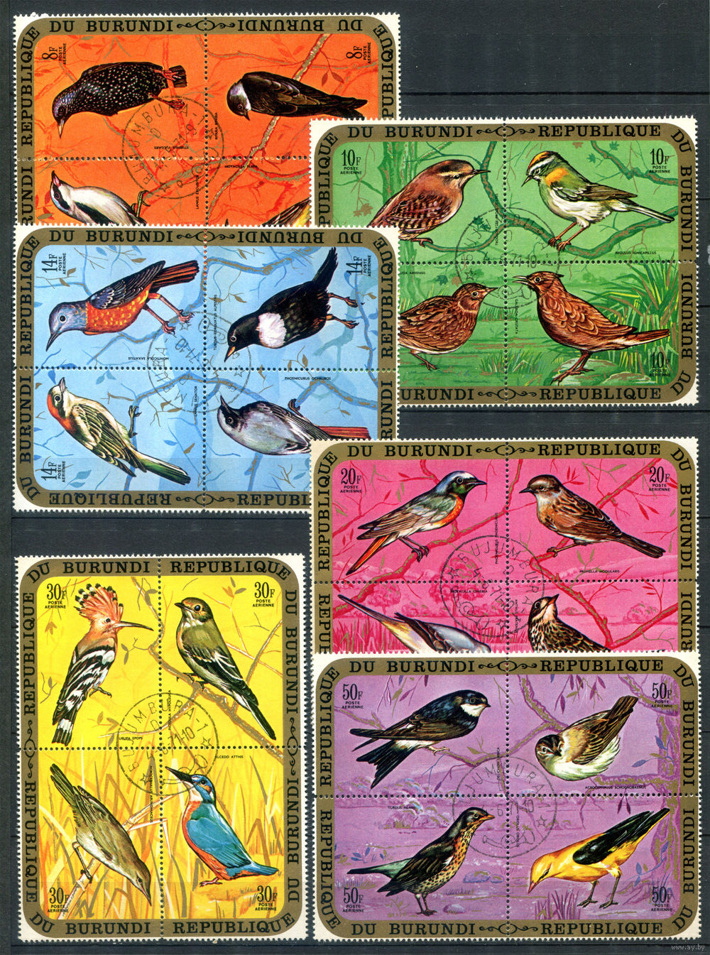 Бурунди - 1970г. - птицы - 36 марок - полная серия, MNH с жёлтыми полосами на клее, гашёные с жёлтыми полосами на клее [Mi 621-656]. #3-Bu-81-B-1