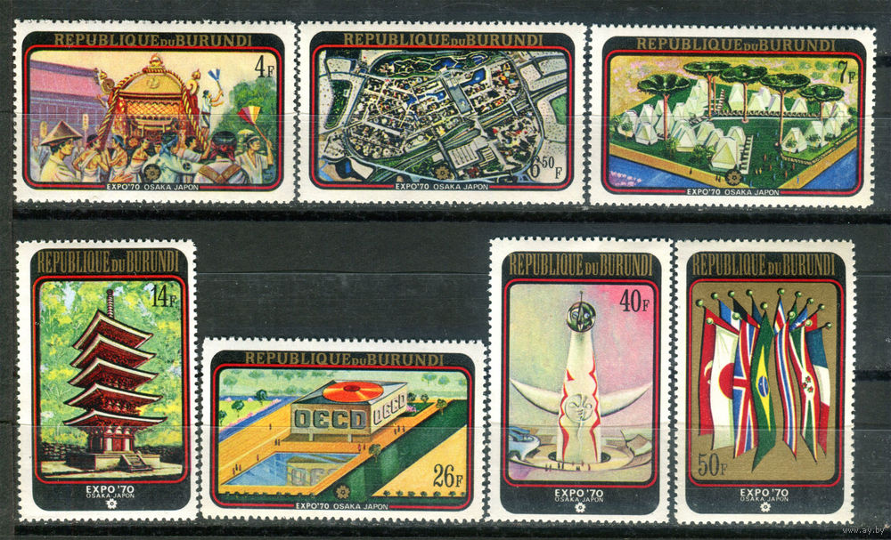 ![Бурунди - 1970г. - Всемирная выставка ЭКСПО 70 в Осаке - 7 марок - полная серия, MNH, 1 марка с отпечатком на клее, 2 с лёгким пожелтением клея [Mi 576 A - 582 A]. #3-Bu-Z-1-22](https://s5-lot.aystatic.by/550x510/229/924/5039/5039924229_0.jpg)