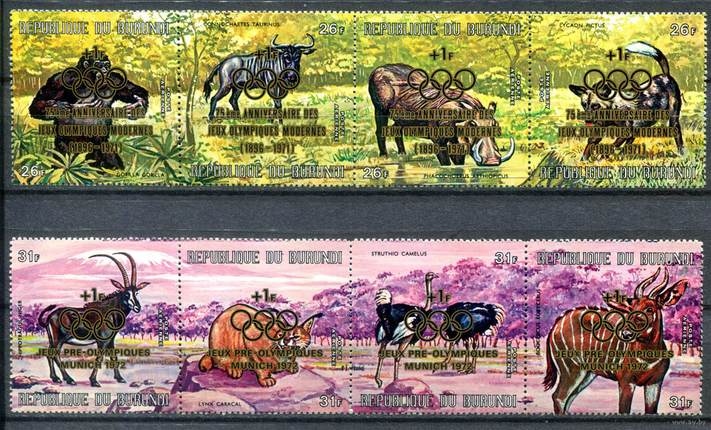![Бурунди - 1971г. - африканские животные, надпечатка Олимпийские игры - 8 марок - 2 сцепки - полная серия, MNH, у каждой сцепки есть по одному сгибу по перфорации [Mi 774-781]. #3-Bu-Z-1-25](https://s3-lot.aystatic.by/550x510/234/53/5040/5040053234_0.jpg)