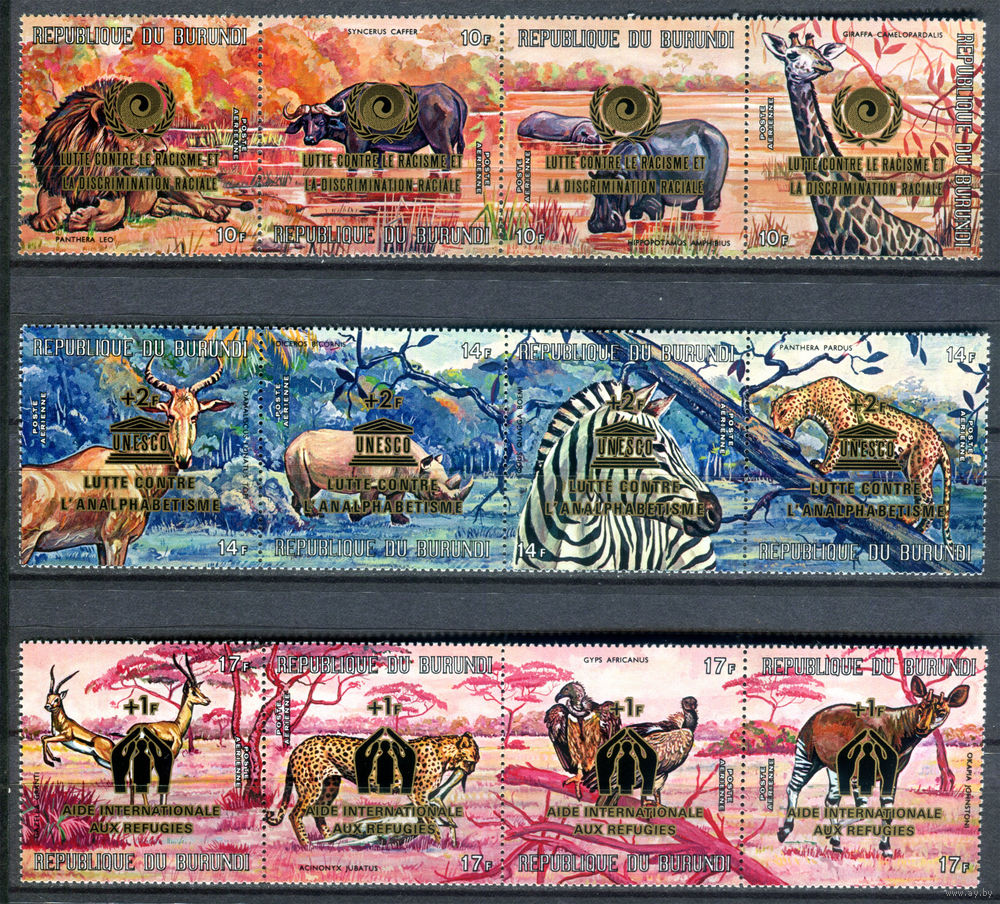 Бурунди - 1971г. - африканские животные, надпечатка ООН - 12 марок - 3 сцепки - полная серия, MNH, у каждой сцепки есть по одному сгибу по перфорации [Mi 762-773]. #3-Bu-Z-1-26
