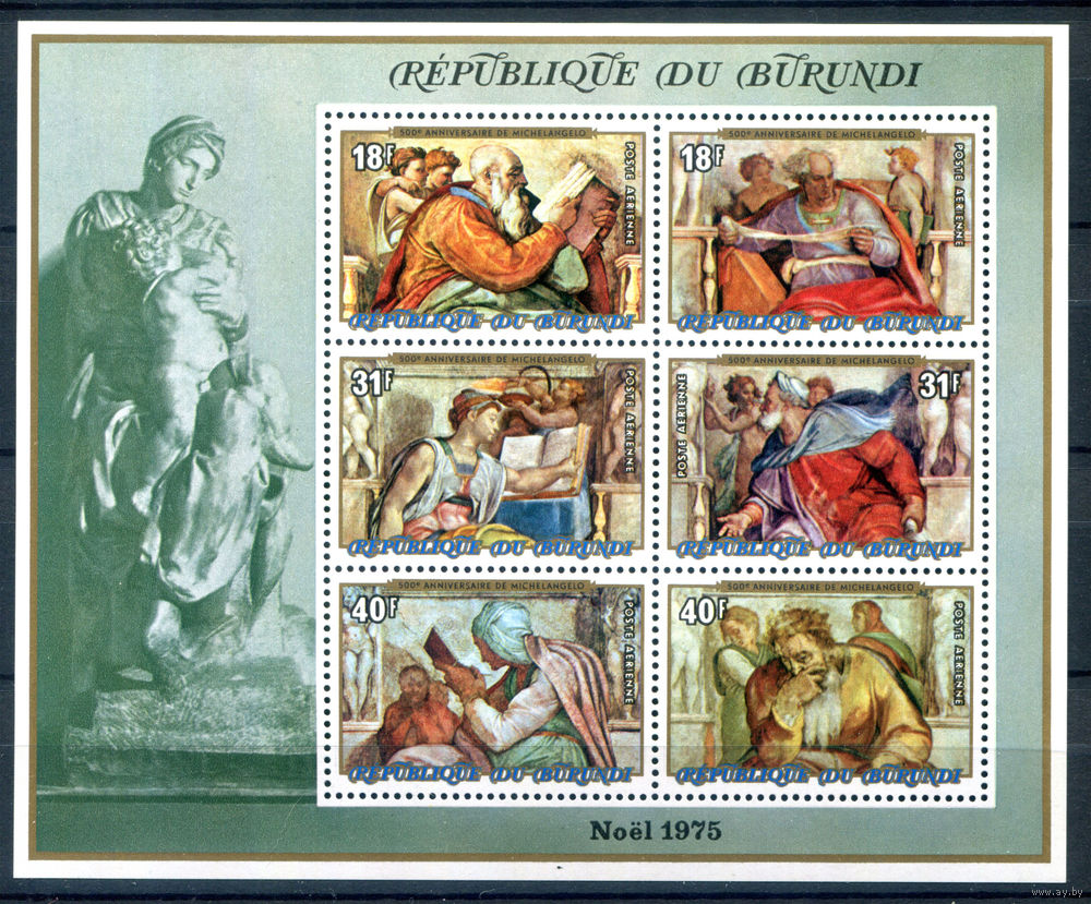 Бурунди - 1975г. - Рождество. 500 лет с дня рождения Микеланджело, фрески Сикстинской капеллы - 1 блок - полная серия, MNH [Mi bl. 87 A]. #3-Bu-Z-2-31