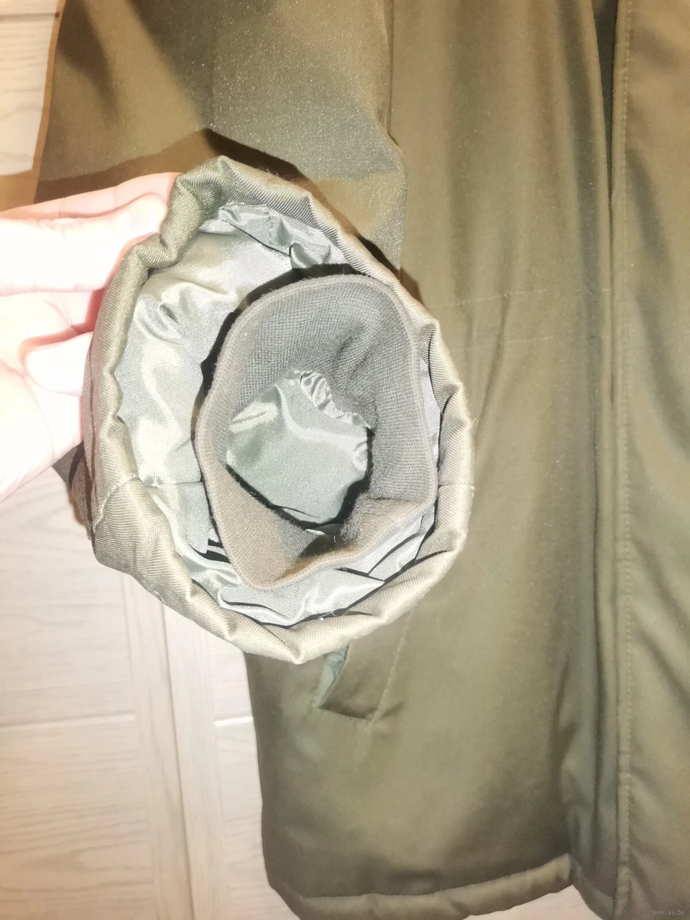 Цвет куртки — темно-оливковый. Куртка на пластиковой двойной молнии + ветрозащитный клапан на металлических пуговицах.
