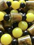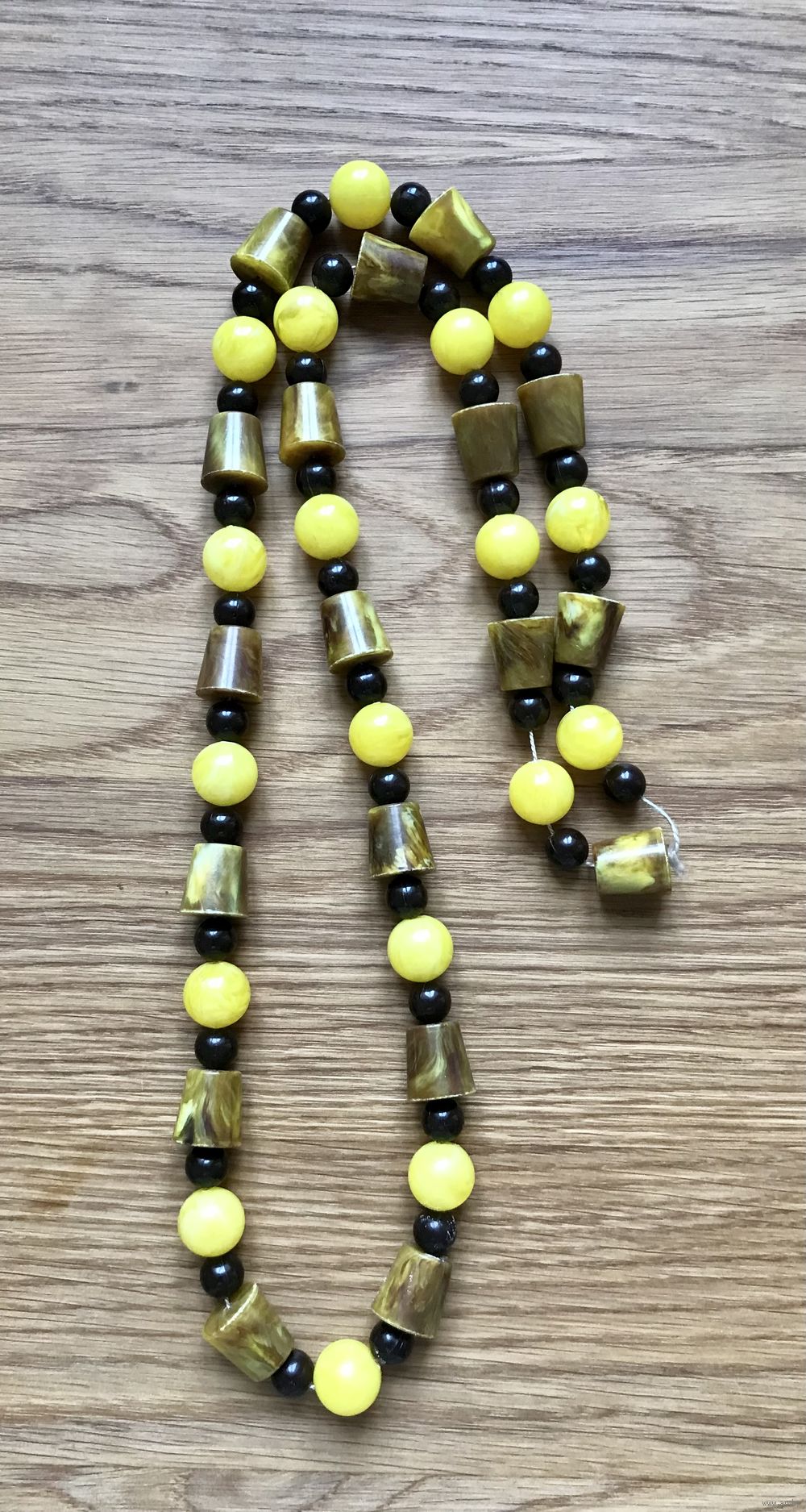Винтажные бусы из ГДР (50-е гг.). Качественный пластик. Имитация янтаря. Длина нитки 86см.(нитка немного растянута), неразъемные. Трапецевидные бусины диаметр верха 1см., диаметр низа 1,4см., желтые бусины диаметром 1,7см., темно-коричневые -0,7см.