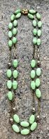 Винтажные двухрядные бусы из стекла и декоративных элементов из металла. Длина верхнего ряда 23см., нижнего 25см. На металлических элементах есть небольшие потёртости и потемнения покрытия. Общее состояние хорошее.