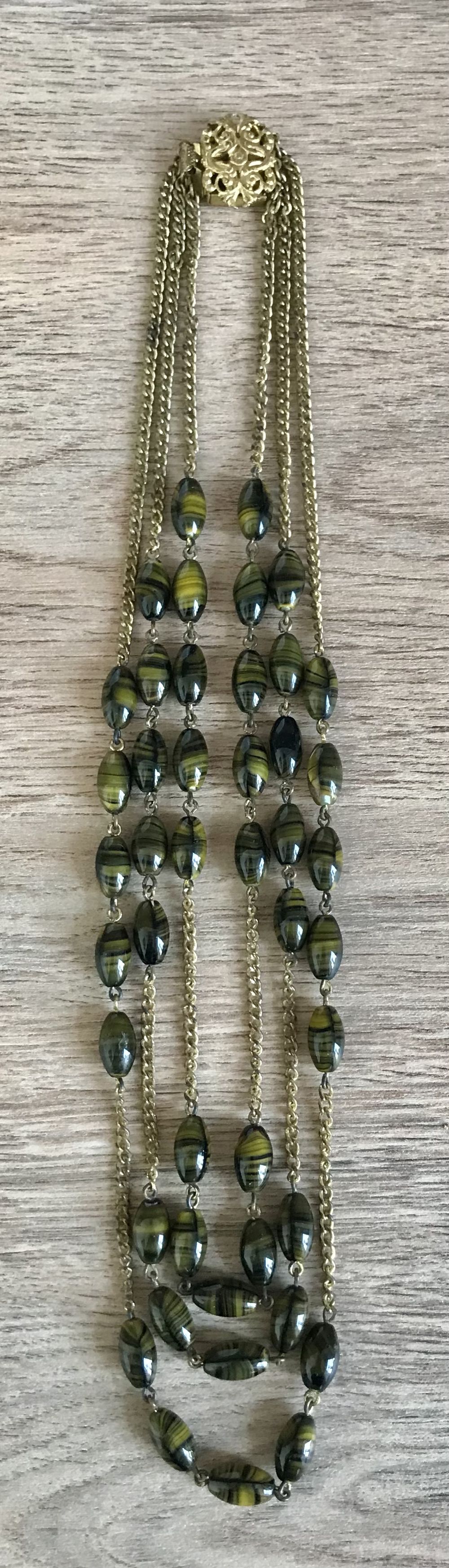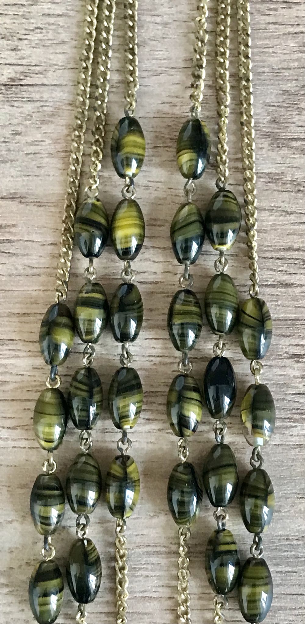 Винтажные трёхрядные бусы из худ.стекла и цепочек. Длина верхнего ряда 47см., нижнего 55см. На цепочках местами есть незначительные потёртости позоры и потемнения. Общее состояние хорошее.
