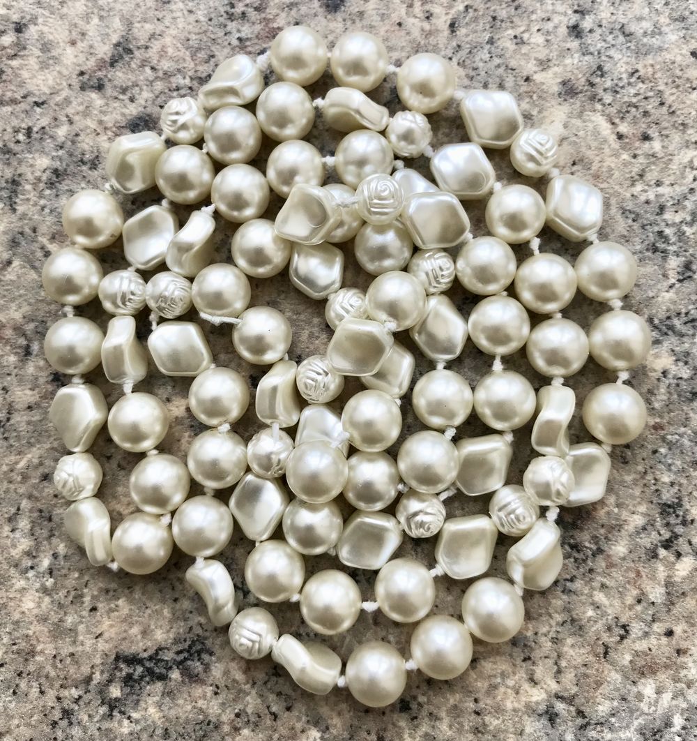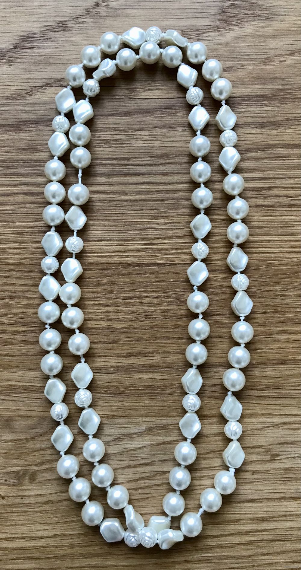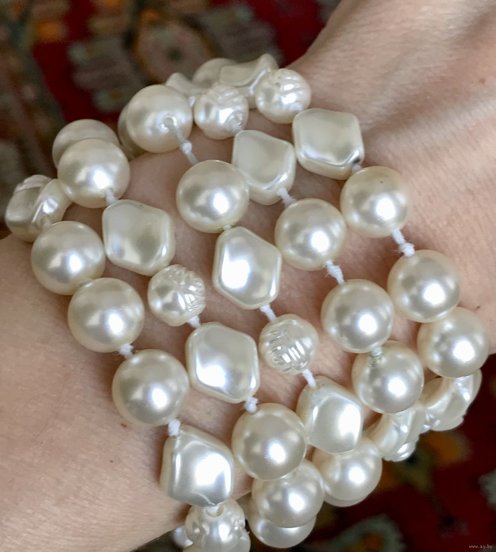 Винтажные бусы из пластика с перламутровым покрытием. Длина 100см. Неразъемные. Диаметр крупной круглой бусины 0,9см., маленькой резной круглой бусины 0,7см., плоская бусина 1х0,8см. Состояние хорошее.