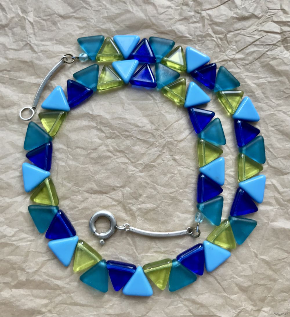 Винтажные бусы из цветного стекла, застёжка из серебра. Размер треугольничка 1,2х1,2х1,2см. Длина 47см. Состояние хорошее.
