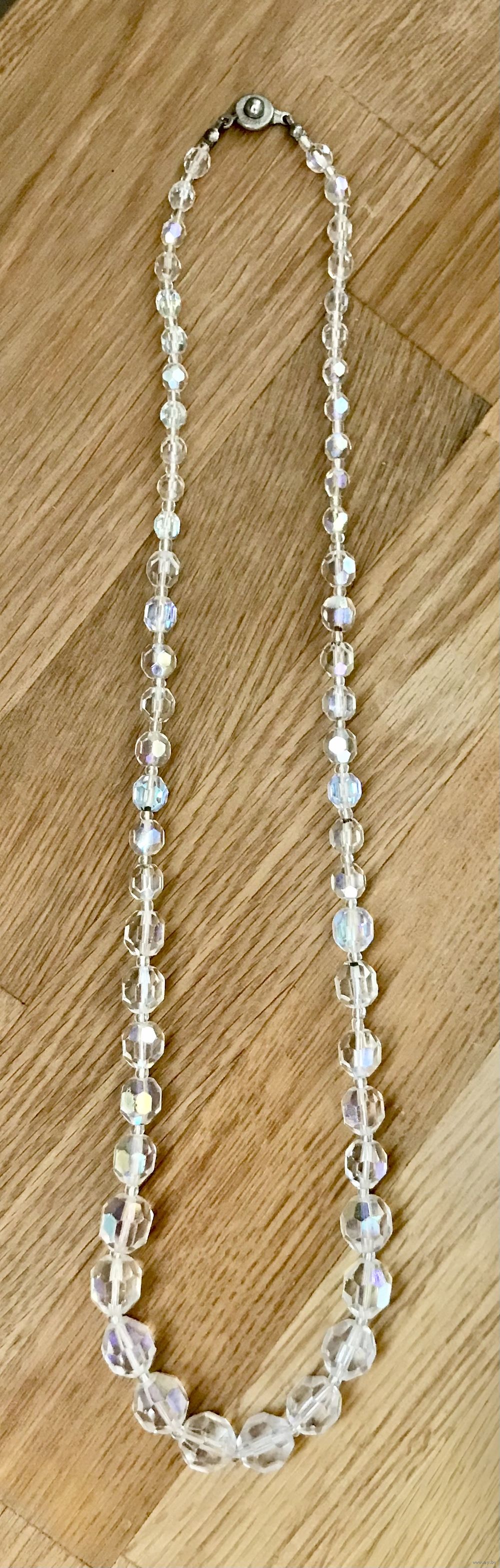Винтажные бусы из стекла с покрытием AB. Размер бусин от 0,5х0,6см. до 1,1х1,2см. Длина 65 см. На гранях нескольких бусин есть незначительные скольчики. Была произведена замена замка. Общее состояние украшения хорошее.